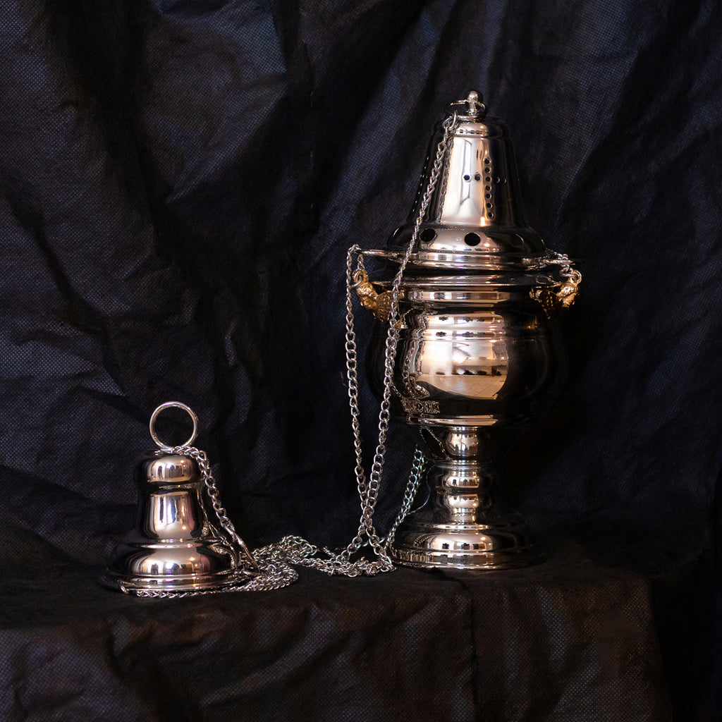 O turíbulo é um dos mais belos e significativos instrumentos da liturgia católica. Este modelo, feito em latão e banhado a níquel, possui os detalhes de três anjos banhados a ouro, de onde saem suas correntes. No interior, um recipiente para colocar as brasas pode ser facilmente removido. As brasas, quando recebem o incenso, fazem exalar um perfume sagrado que envolve a igreja numa névoa de fumaça. Este gesto, impregnado de simbolismo, recorda as palavras do salmista: “Suba à vossa presença a minha oração como incenso” (Sl 140,2). A fumaça ascendente, que se eleva lenta e majestosa, é um sinal visível da oração dos fiéis que sobe reverente até Deus.