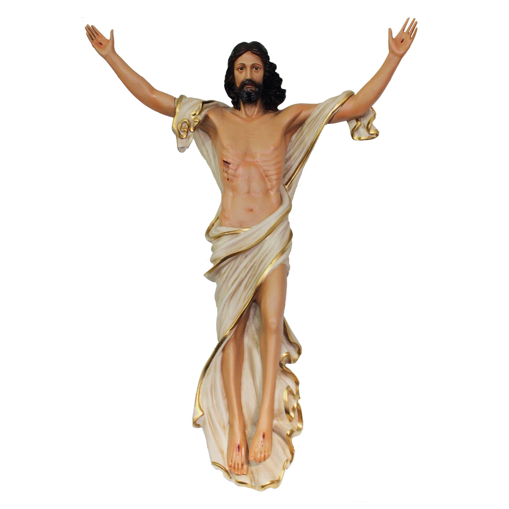 Esta é nossa imagem do Senhor Ressuscitado com os braços abertos, própria para ser colocada na parede do presbitério, sacristia ou no salão paroquial. É uma bela imagem que nos mostra o Senhor revestido de sua glória e que, ao mesmo tempo, nos convida a partilhar de sua paz, aquela que emana de sua Ressurreição.