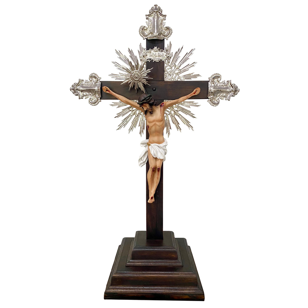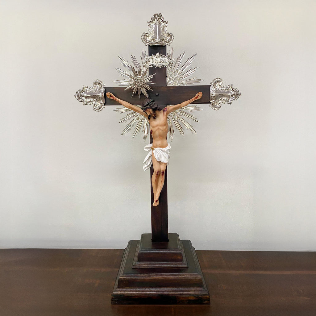 Esse é o nosso Crucifixo com ornamentos metálicos banhados a níquel. Mais indicado para uso em uma sacristia ou mesmo sobre o Retábulo do Altar, essa belíssima peça, também com sua madeira escura e ornamentos metálicos, sublinha o caráter glorioso da Paixão e Morte de Nosso Senhor Jesus Cristo e leva quem a olha à inevitável contemplação do Sacrifício Redentor de Cristo na Cruz.