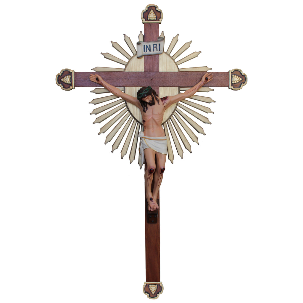 Esse é nosso Crucifixo especialmente concebido para colocar no presbitério da igreja, da capela ou no salão paroquial. A Cruz é feita em madeira maciça de Jequitibá Rosa. A imagem e a plaquinha INRI são feitas em resina de alta durabilidade e resistência. Nessa versão, a peça é ornada com ponteiras e resplendor, o que ressalta o caráter glorioso da Cruz de Nosso Senhor Jesus Cristo.