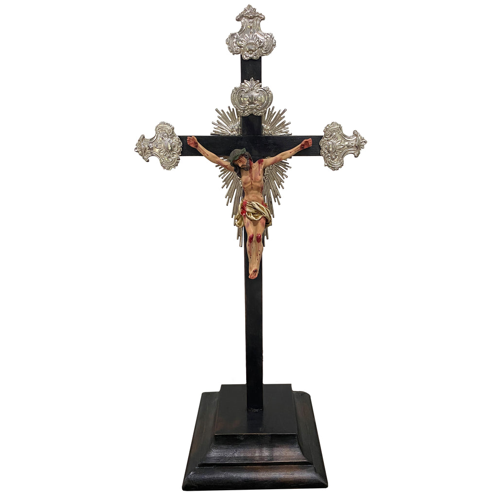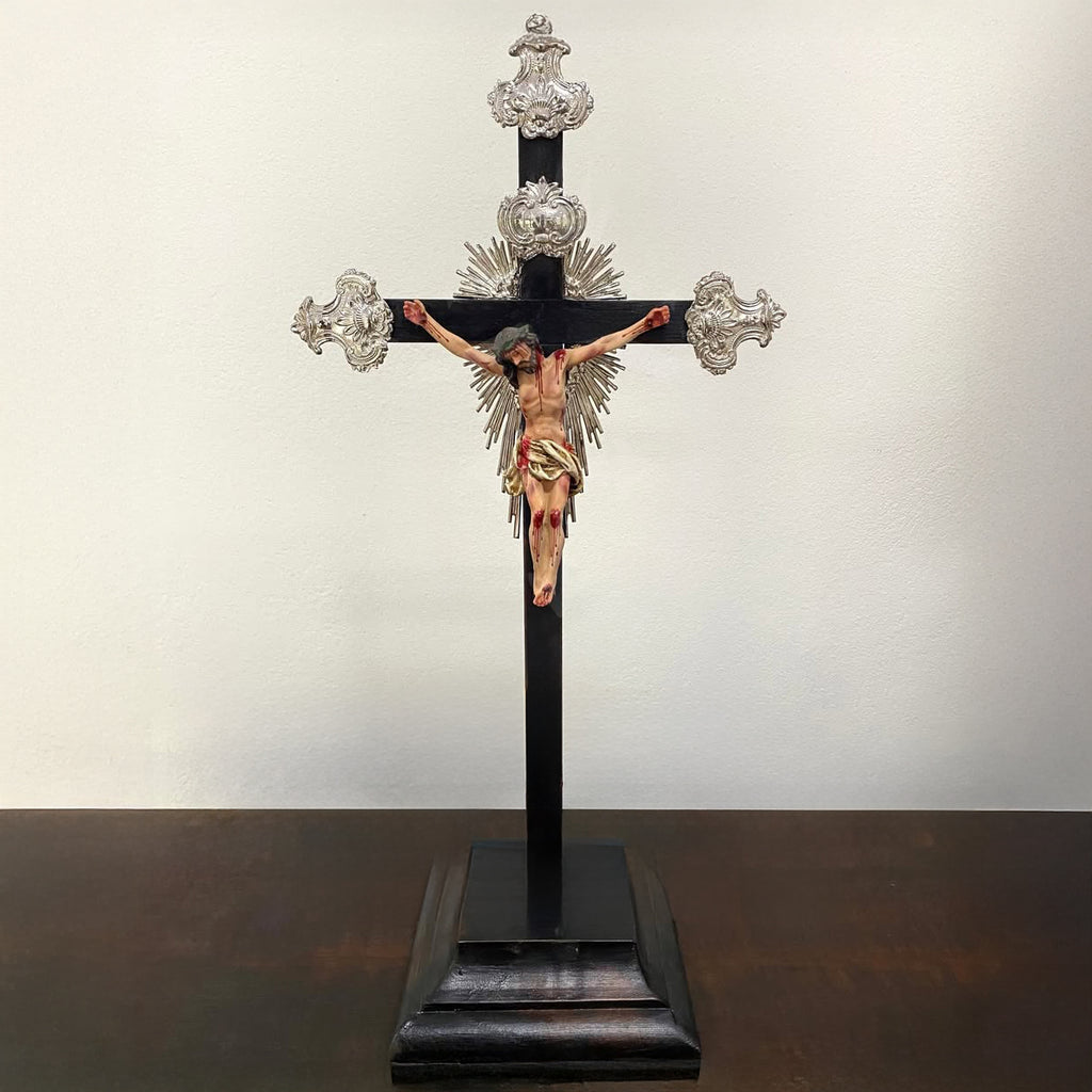 Esse é o nosso Crucifixo de mesa com ornamentos metálicos banhados a níquel. Mais indicado para uso em uma sacristia, escritório ou residência, essa belíssima peça, também com sua madeira escura e ornamentos metálicos, sublinha o caráter glorioso da Paixão e Morte de Nosso Senhor Jesus Cristo e leva quem a olha à inevitável contemplação do Sacrifício Redentor de Cristo na Cruz.