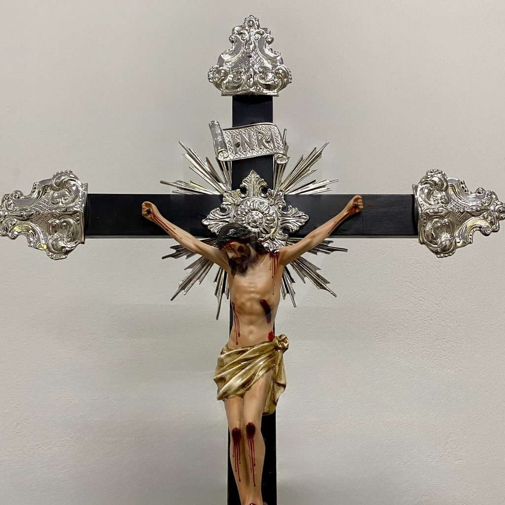 Esse é o nosso Crucifixo com ornamentos metálicos banhados a níquel. Mais indicado para uso em uma sacristia, escritório ou residência, essa belíssima peça, também com sua madeira escura e ornamentos metálicos, sublinha o caráter glorioso da Paixão e Morte de Nosso Senhor Jesus Cristo e leva quem a olha à inevitável contemplação do Sacrifício Redentor de Cristo na Cruz.