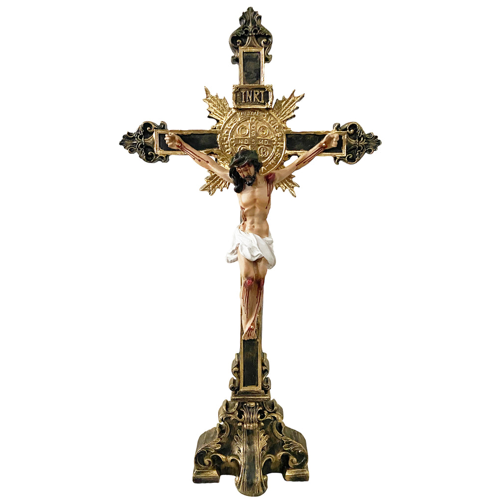 Esse é nosso Crucifixo para ser utilizado em um oratório de devoção particular, uma mesa de sacristia ou de escritório e até mesmo para ser posto sobre a Mesa do Altar para a celebração da Santa Missa. A peça carrega atrás do Crucificado uma representação da tradicional Medalha de São Bento. Peça feita em resina de alta durabilidade e resistência.