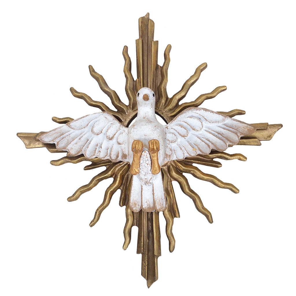 A imagem do Divino Espírito Santo nos recorda a Terceira Pessoa da Santíssima Trindade, que procede do Pai e do Filho, e que é Senhor e doador da vida. Representado sob a forma de uma pomba radiante, o Espírito Santo é o consolador perfeito, a luz dos corações, o hóspede das almas fiéis e o fogo divino que transforma e santifica. Na história da salvação, é Ele quem aplica em cada alma os méritos da Cruz de Cristo. Foi enviado aos Apóstolos no Cenáculo no dia de Pentecostes, inaugurando a missão evangelizadora da Igreja. É o Espírito quem move os corações à conversão, quem ilumina a inteligência e fortalece a vontade no caminho da graça.