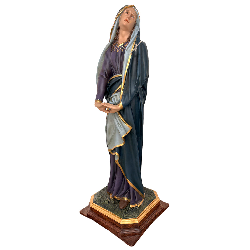 A imagem da Virgem das Dores é um profundo convite à contemplação do sofrimento de Maria unido à Paixão de seu Filho Jesus. Representada com o coração traspassado por uma espada, esta imagem expressa cada uma das sete dores vividas pela Virgem, desde a profecia de Simeão até o sepultamento de Cristo. É uma devoção que remonta ao século XI e foi amplamente difundida pela Ordem dos Servos de Maria, especialmente com a celebração do Setenário das Dores. Com semblante sereno, mas marcado pela dor, Maria é mostrada como aquela que permaneceu de pé aos pés da cruz, como a Igreja canta no hino do Stabat Mater, tornando-se exemplo de fé e fortaleza para todos os cristãos. Esta representação nos convida a unir nossos sofrimentos ao de Cristo, guiados pelo coração materno de Maria.