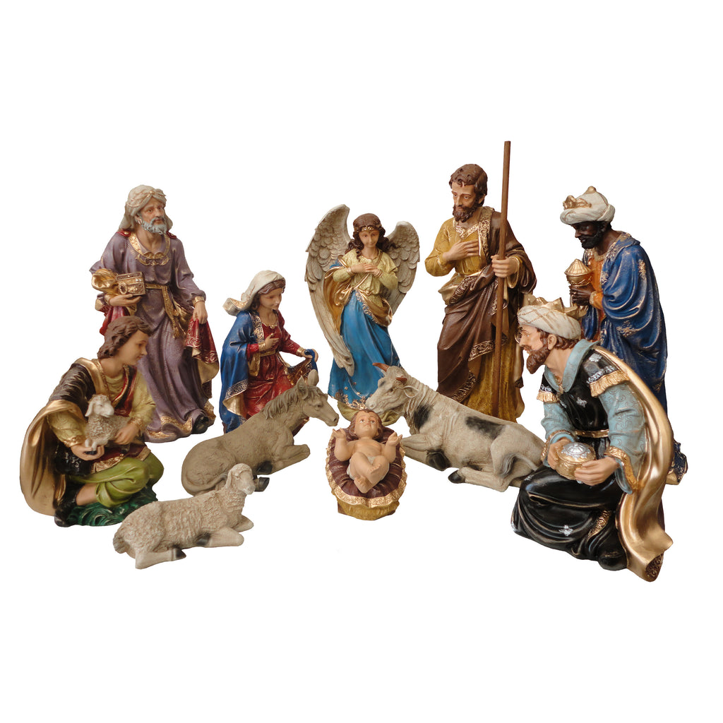 Componentes e dimensões 1x São José - 60cm 1x Nossa Senhora - 40cm 1x Menino Jesus - 25cm 1x Manjedoura - 27cm 1x Rei Mago Incenso - 60cm 1x Rei Mago Mirra - 40cm 1x Rei Mago Ouro - 60cm 1x Pastor - 40cm 1x Vaca - 30cm 1x Burro - 30cm 1x Ovelha - 20cm 1x Anjo - 60cm