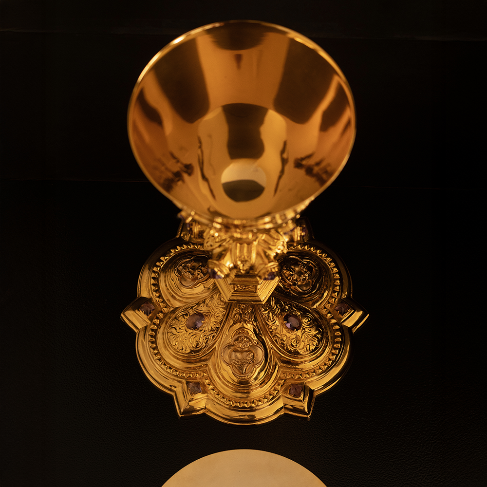 Com o nome latino que se traduz para “Coração de Amor”, o belíssimo Cálice Cor Amoris foi assim batizado pois possui, em sua base, as representações do Sacratíssimo Coração de Jesus, do Imaculado Coração de Maria e do Castíssimo Coração de José. Com um imponente estilo gótico, este vaso sagrado traz uma estrutura totalmente inédita, marcada pela riqueza de detalhes e por uma composição de grandeza e majestade, digna de receber o Preciosíssimo Sangue de Nosso Senhor. Além disso, este é o primeiro cálice de nossa linha já ornamentado, de forma padrão, com ametistas naturais, isto é, pedras preciosas genuínas, lapidadas especialmente para compor esta peça!