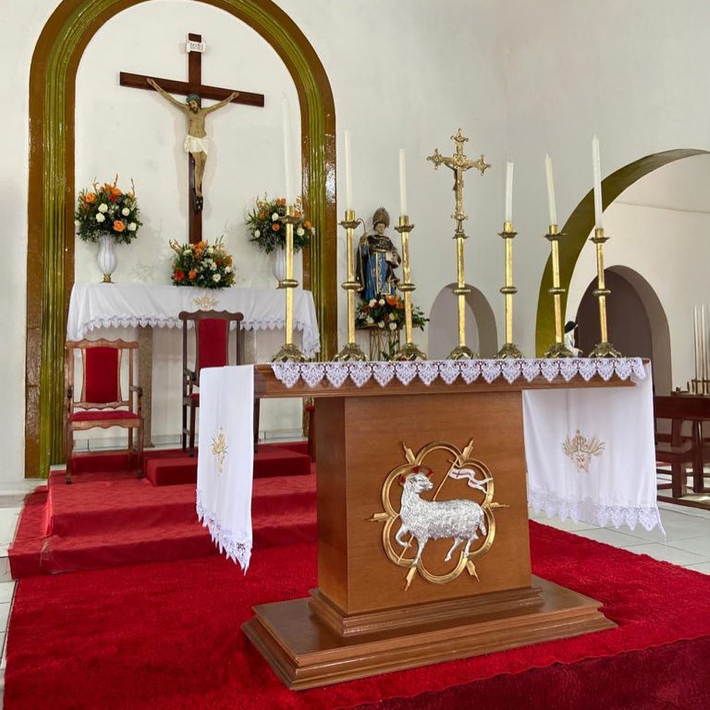 O Altar Cordeiro é uma peça feita em madeira maciça de jequitibá-rosa e ornada com o aplique do Cordeiro de Deus, feito em resina. A imagem do Cordeiro evoca de maneira ímpar o sacrifício que se realiza sobre o Altar na Santa Missa, onde o próprio Senhor está como sacerdote, altar e vítima.