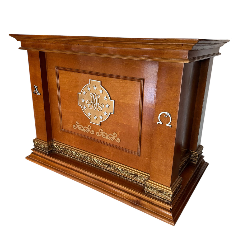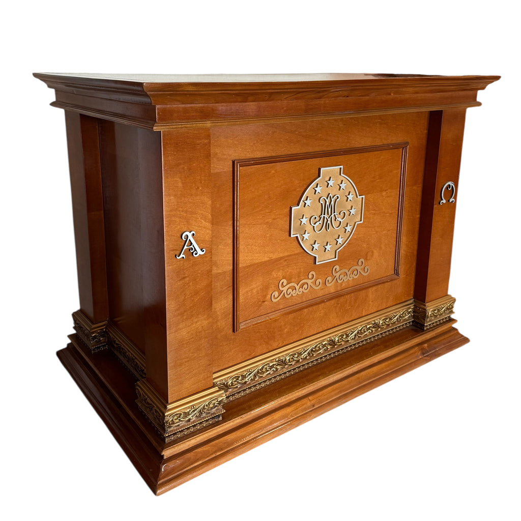 O Altar Mãe de Deus é uma peça feita em madeira maciça de jequitibá-rosa e ornada com o aplique do Mariograma, inicial do nome santíssimo da Virgem Maria. Com este Altar, homenageamos a Maternidade Divina de Nossa Senhora: em seu seio, o Verbo se fez carne; sobre o Altar, o mesmo Verbo se oferece em sacrifício. Possui também a Credência que lhe faz conjunto.