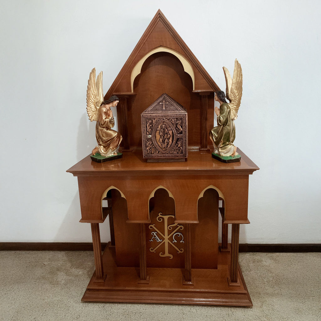 O Altar Retábulo é uma peça feita em madeira maciça de jequitibá-rosa que possui, em sua parte posterior, uma elevação em forma de cúpula, além de possuir um elegante acabamento em colunas. É mais indicado para servir de Altar para o Sacrário, a ser posto na Capela do Santíssimo.