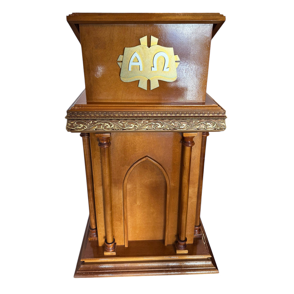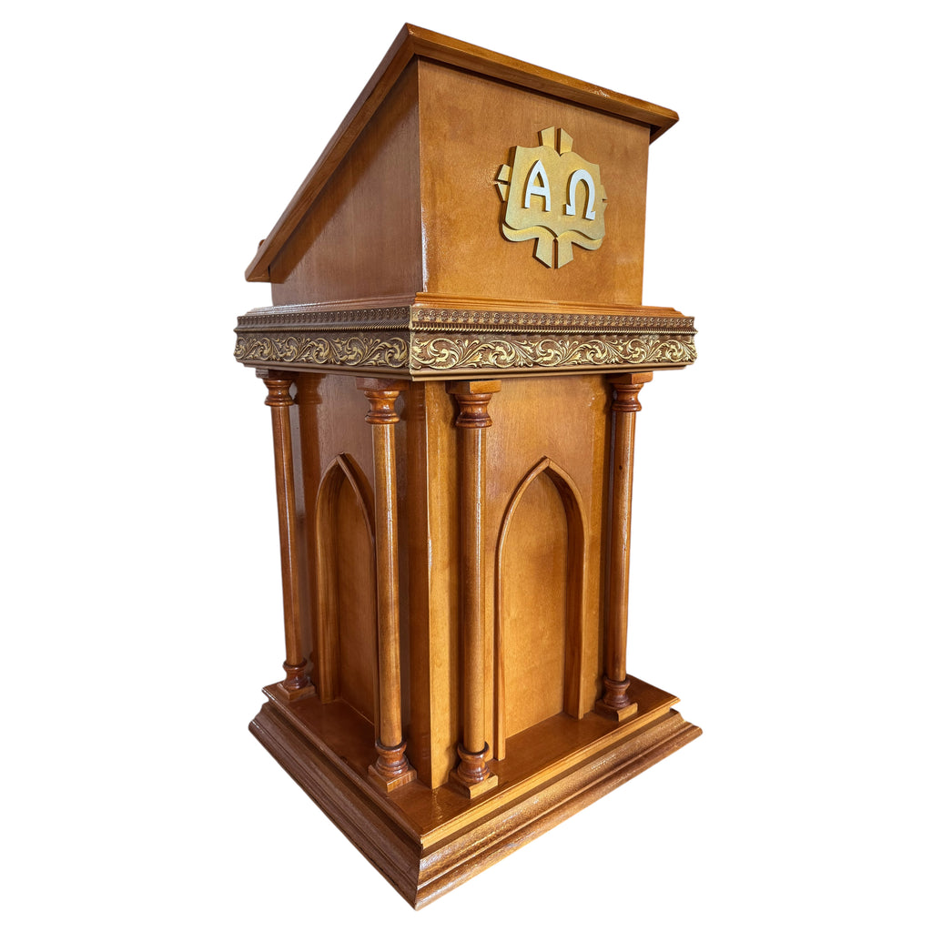 O Ambão, também chamado de Mesa da Palavra, é o lugar sagrado destinado ao anúncio da Palavra de Deus. Nele ressoa a voz da Igreja que proclama, com autoridade e solenidade, as Escrituras Sagradas, ecoando o Verbo eterno que se fez carne. É imagem da montanha bíblica, de onde Deus fala ao seu povo, e também símbolo da pedra do sepulcro vazia, testemunha da Ressurreição, de onde parte a alegre notícia do Evangelho. Assim, o Ambão ocupa lugar próprio no espaço litúrgico, digno e distinto, para que a Palavra seja ouvida com atenção e veneração.