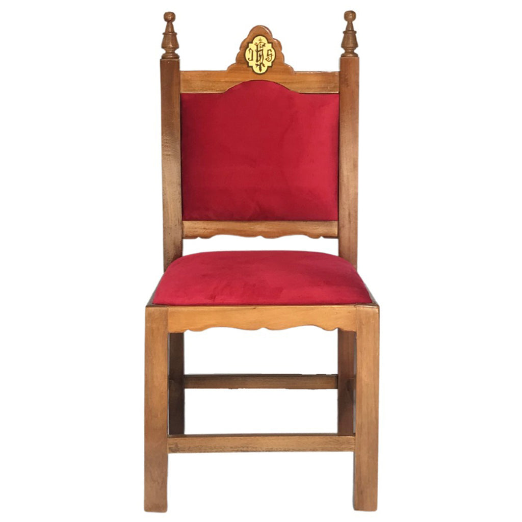 A Cadeira JHS Concelebrante é concebida para ser utilizada pelo concelebrante da Santa Missa ou pelo diácono, bem como por acólitos ou coroinhas, em missas menos solenes. A cadeira apresenta, no topo, as iniciais JHS, acrônimo de Jesus Hominum Salvator, que evoca o nome de Jesus como Salvador dos Homens. Produzida em nobre madeira maciça de jequitibá-rosa, possui assento e encosto acolchoados, revestidos em veludo vermelho.