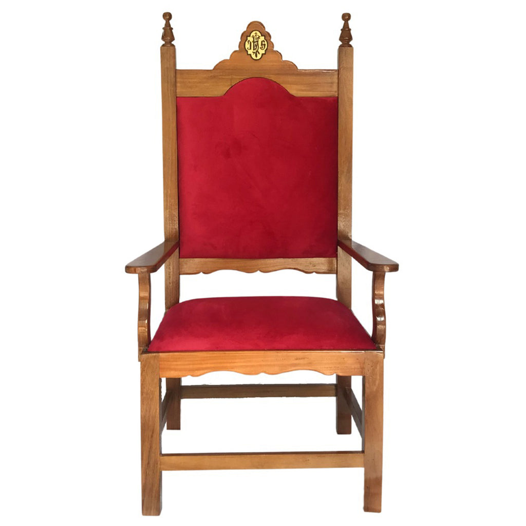 A Cadeira JHS Presidencial é concebida para ser utilizada pelo celebrante principal da Santa Missa. Distinguindo-se por sua altura imponente e provida de apoio para os braços, apresenta, no topo, as iniciais JHS, acrônimo de Jesus Hominum Salvator, que evoca o nome de Jesus como Salvador dos Homens. Produzida em nobre madeira maciça de jequitibá-rosa, possui assento e encosto acolchoados, revestidos em veludo vermelho.