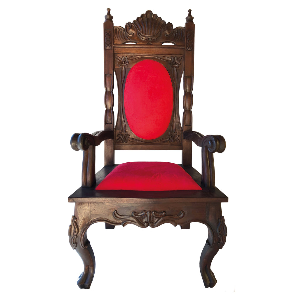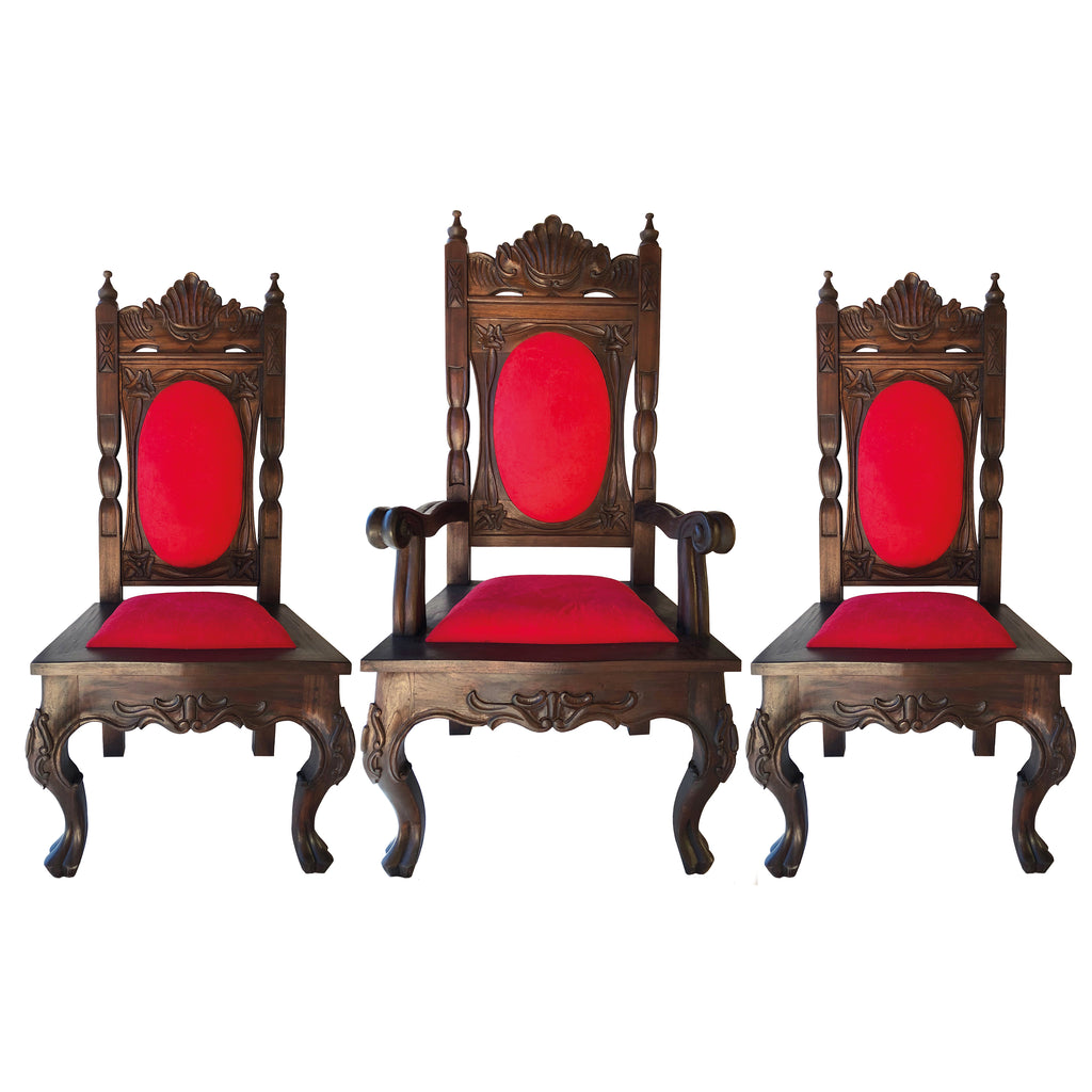 Produzidas em nobre madeira maciça, as cadeiras possuem um assento acolchoado, revestido em veludo vermelho.