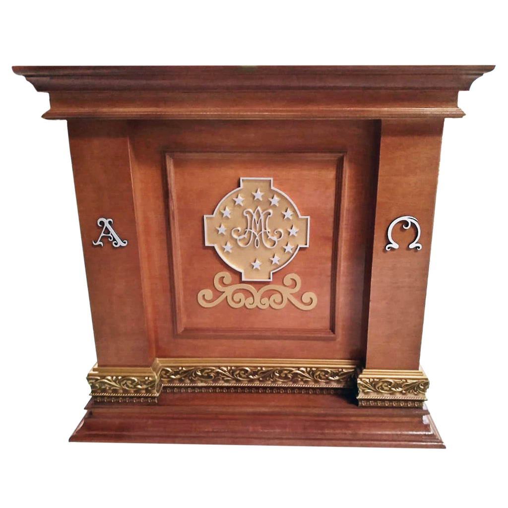 Este modelo é ornado com o aplique do Mariograma, inicial do nome santíssimo da Virgem Maria, pela qual homenageamos a Maternidade Divina de Nossa Senhora. Possui também o Altar que lhe faz conjunto.