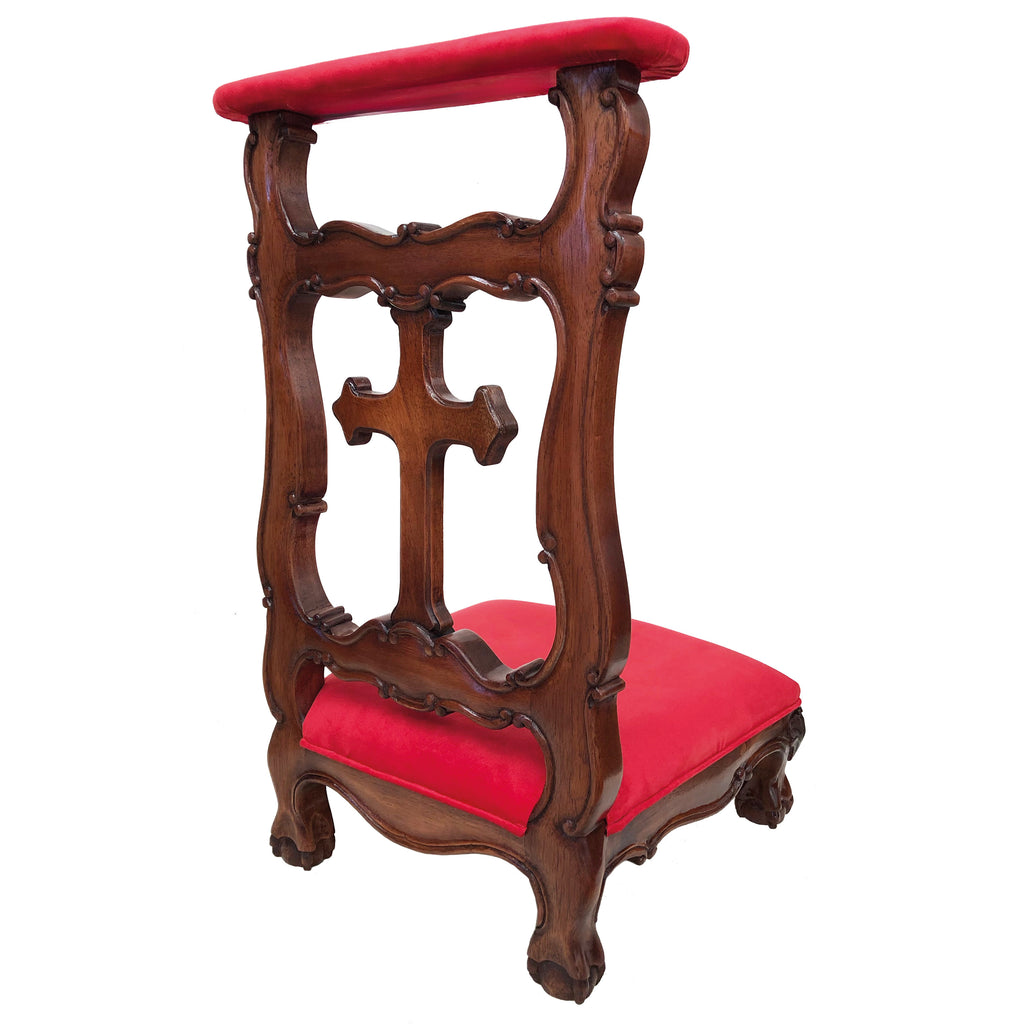 Este modelo apresenta todo seu corpo entalhado à mão na própria madeira, em um belo estilo barroco. Produzido em nobre madeira maciça, possui os apoios acolchoados para os joelhos e as mãos, revestidos em veludo vermelho.