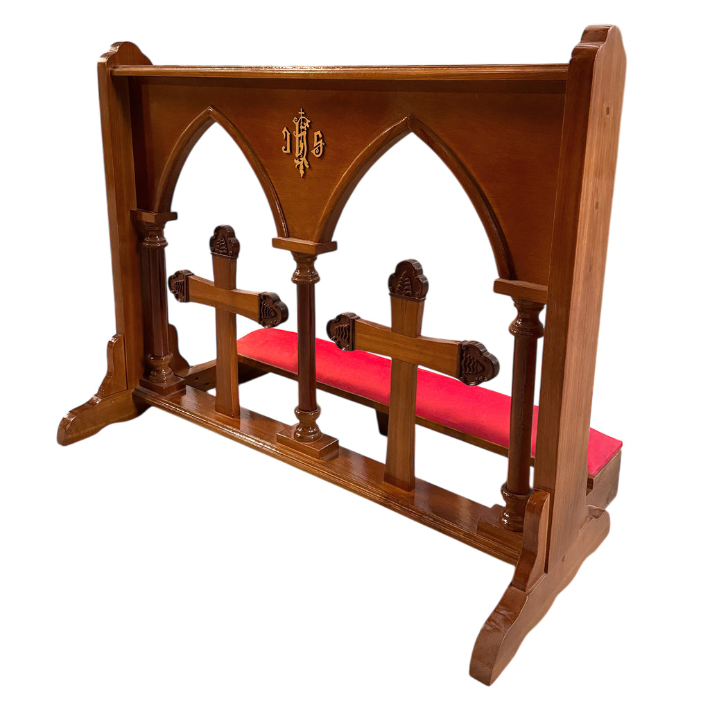 Este modelo apresenta um rico acabamento em estilo gótico, com arcos ogivais e uma cruz ao centro, ornada com ponteiras em formato de flor-de-lis. Produzido em nobre madeira maciça, possui os apoios acolchoados para os joelhos, revestidos em veludo vermelho.