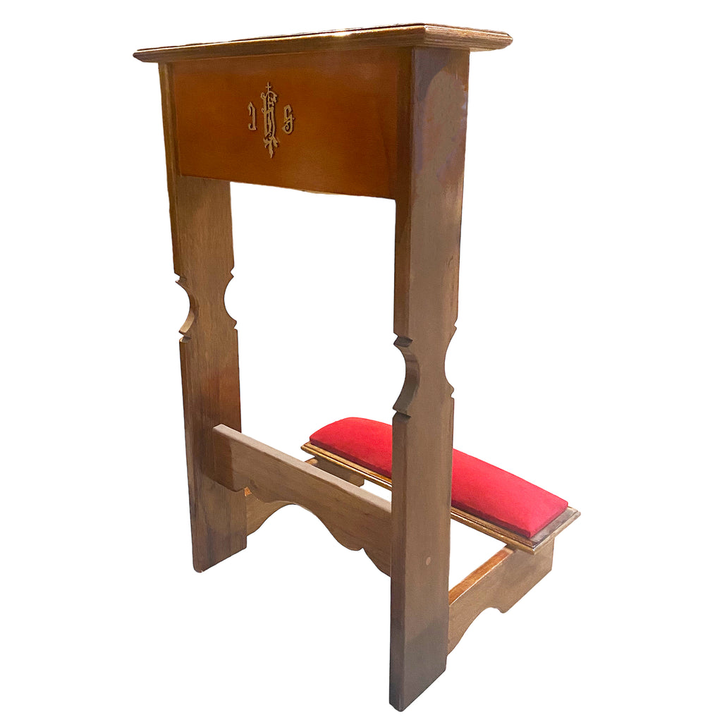 Este modelo apresenta, no topo, as iniciais JHS, acrônimo de Jesus Hominum Salvator, que evoca o nome de Jesus como Salvador dos Homens. Produzido em nobre madeira maciça, possui os apoios acolchoados para os joelhos, revestidos em veludo vermelho.