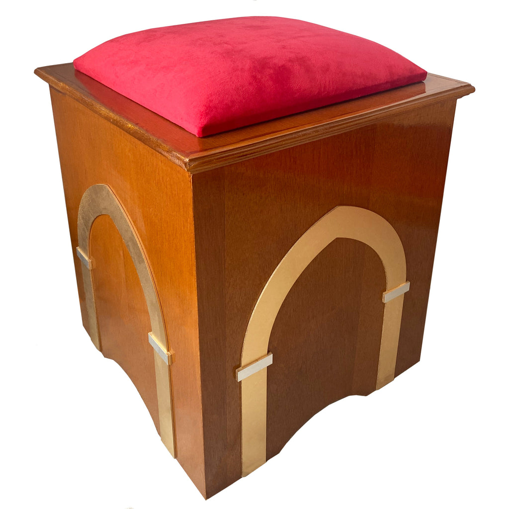 O Mocho Arcos é uma peça concebida para ser utilizada por todos que servem ao Altar, ou seja, acólitos, instituídos ou não, coroinhas, leitores ou ministros extraordinários da comunhão. O mocho apresenta um estilo gótico composto por arcos ogivais. Produzido em nobre madeira maciça de jequitibá-rosa, possui assento acolchoado, revestido em veludo vermelho.