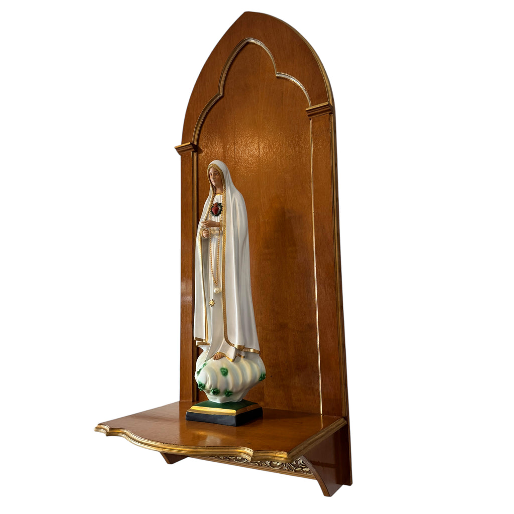 O Nicho Arcos é uma peça feita em madeira maciça de jequitibá-rosa, com acabamento em verniz e detalhes em dourado. Seus belos arcos ogivais denotam um estilo predominantemente gótico. Possui ainda uma bela moldura dourada na parte inferior.
