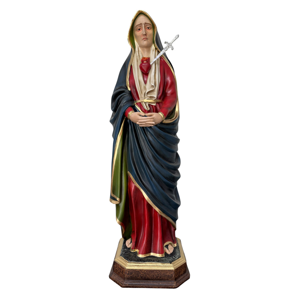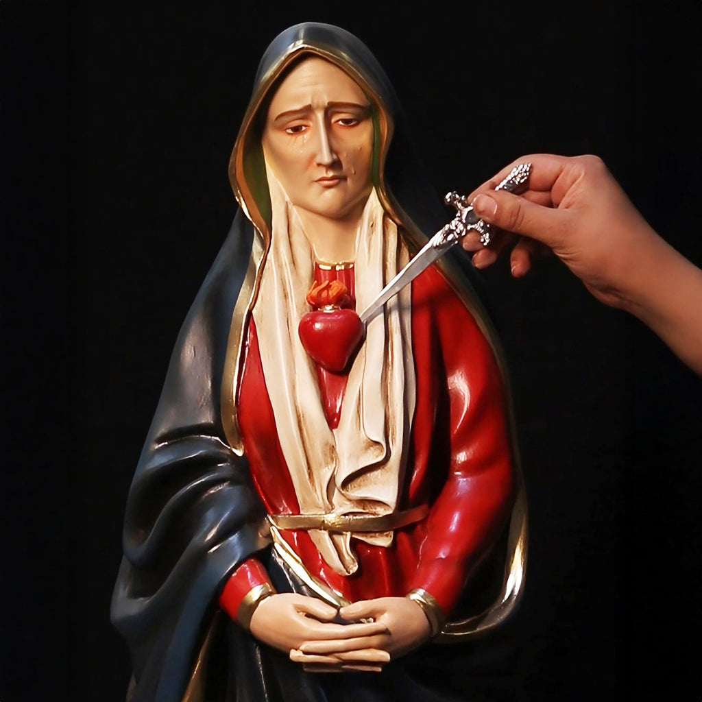 A imagem da Virgem das Dores é um profundo convite à contemplação do sofrimento de Maria unido à Paixão de seu Filho Jesus. Representada com o coração traspassado por uma espada, esta imagem expressa cada uma das sete dores vividas pela Virgem, desde a profecia de Simeão até o sepultamento de Cristo. É uma devoção que remonta ao século XI e foi amplamente difundida pela Ordem dos Servos de Maria, especialmente com a celebração do Setenário das Dores. Com semblante sereno, mas marcado pela dor, Maria é mostrada como aquela que permaneceu de pé aos pés da cruz, como a Igreja canta no hino do Stabat Mater, tornando-se exemplo de fé e fortaleza para todos os cristãos. Esta representação nos convida a unir nossos sofrimentos ao de Cristo, guiados pelo coração materno de Maria.