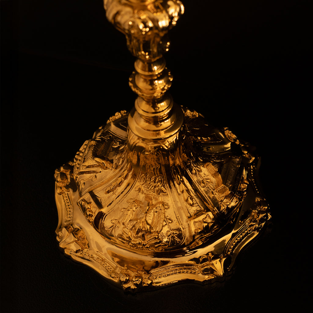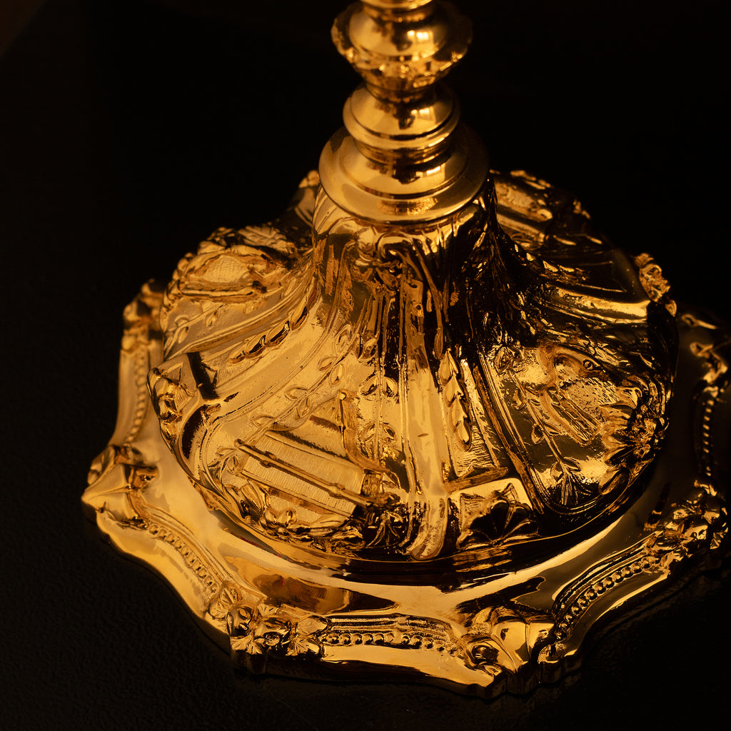 Confeccionada em liga metálica fundida de altíssima qualidade, sendo o copo e a tampa feitas em latão, esta âmbula é banhada a ouro 24 quilates.