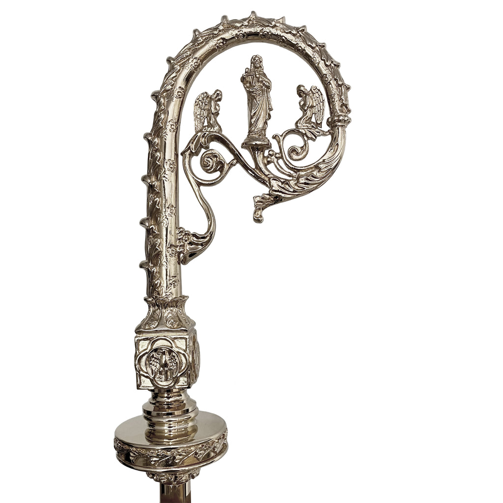 O Báculo São Carlos Borromeu é uma peça dedicada ao grande santo Arcebispo de Milão, reconhecido por seus planos grandiosos de reestruturação de sua arquidiocese e da Igreja. A belíssima insígnia episcopal carrega em sua voluta a imagem de Nosso Senhor Jesus Cristo ladeado por dois Anjos em adoração. Além disso, na parte inferior, está o tetramorfo com os símbolos dos Quatro Evangelistas. Essa é uma peça rica em detalhes e digna do Terceiro Grau do Sacramento da Ordem, tal como deixado por Nosso Senhor.