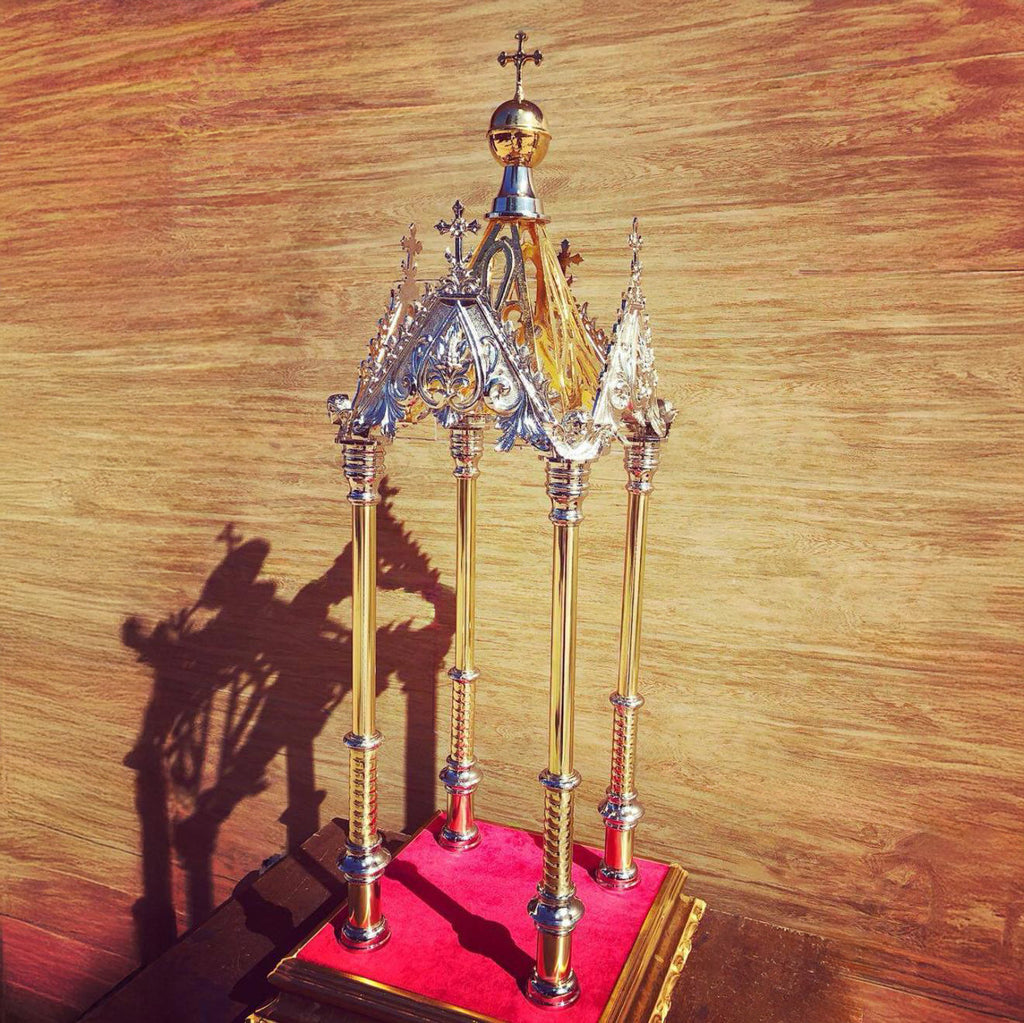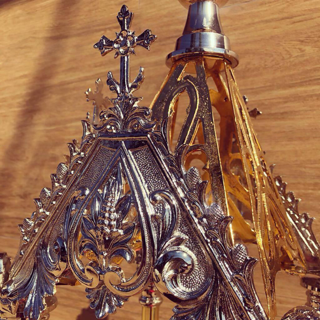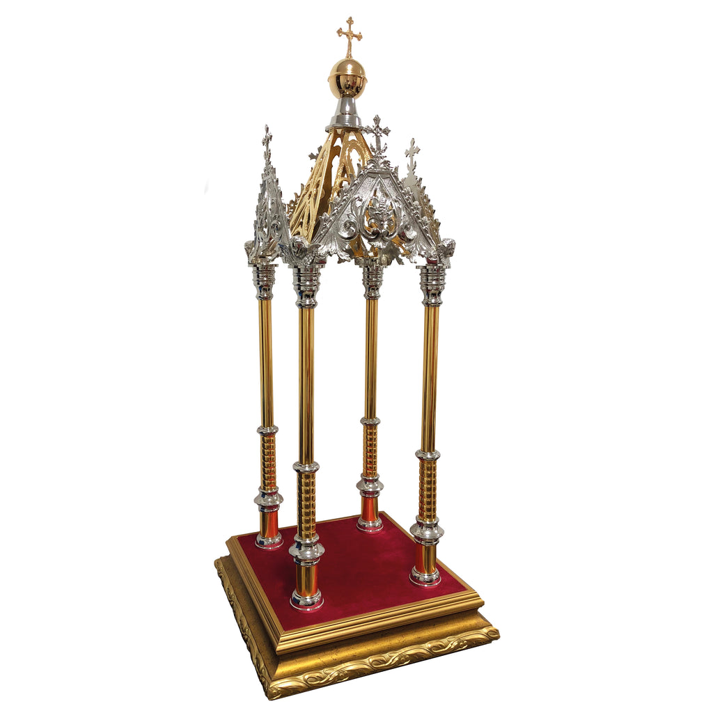 Esta nobre peça, de forte estilo gótico, é formada por uma base em madeira com veludo vermelho, sobre a qual erguem elegantes colunas banhadas a ouro. A belíssima cúpula possui acabamento misto de banho de ouro e banho de níquel, sobre a qual está o globo com a Cruz do Senhor.