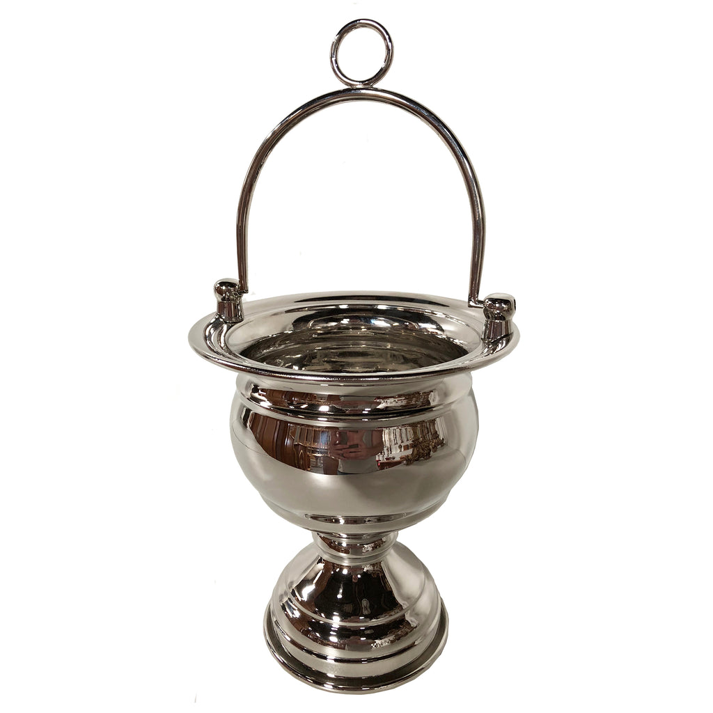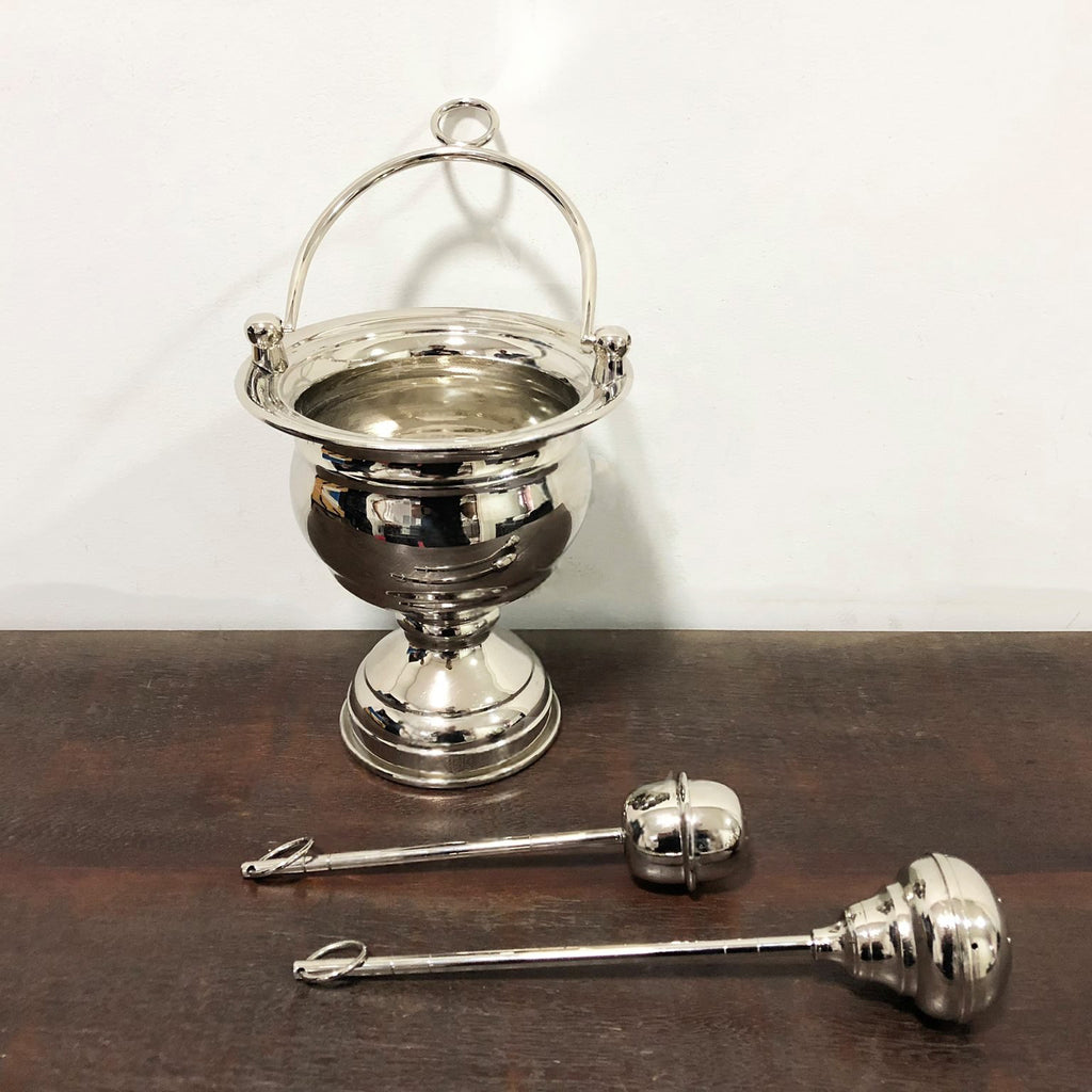 Utilizada nas celebrações litúrgicas e bênçãos, a caldeirinha é o recipiente destinado a conter a água benta, que será aspergida sobre os fiéis por meio do aspersório. Segundo a tradição da Igreja, a água é um poderoso símbolo de purificação e bênção, evocando o mistério de Cristo, que se revelou como a água viva e instituiu o batismo como sinal da salvação.
