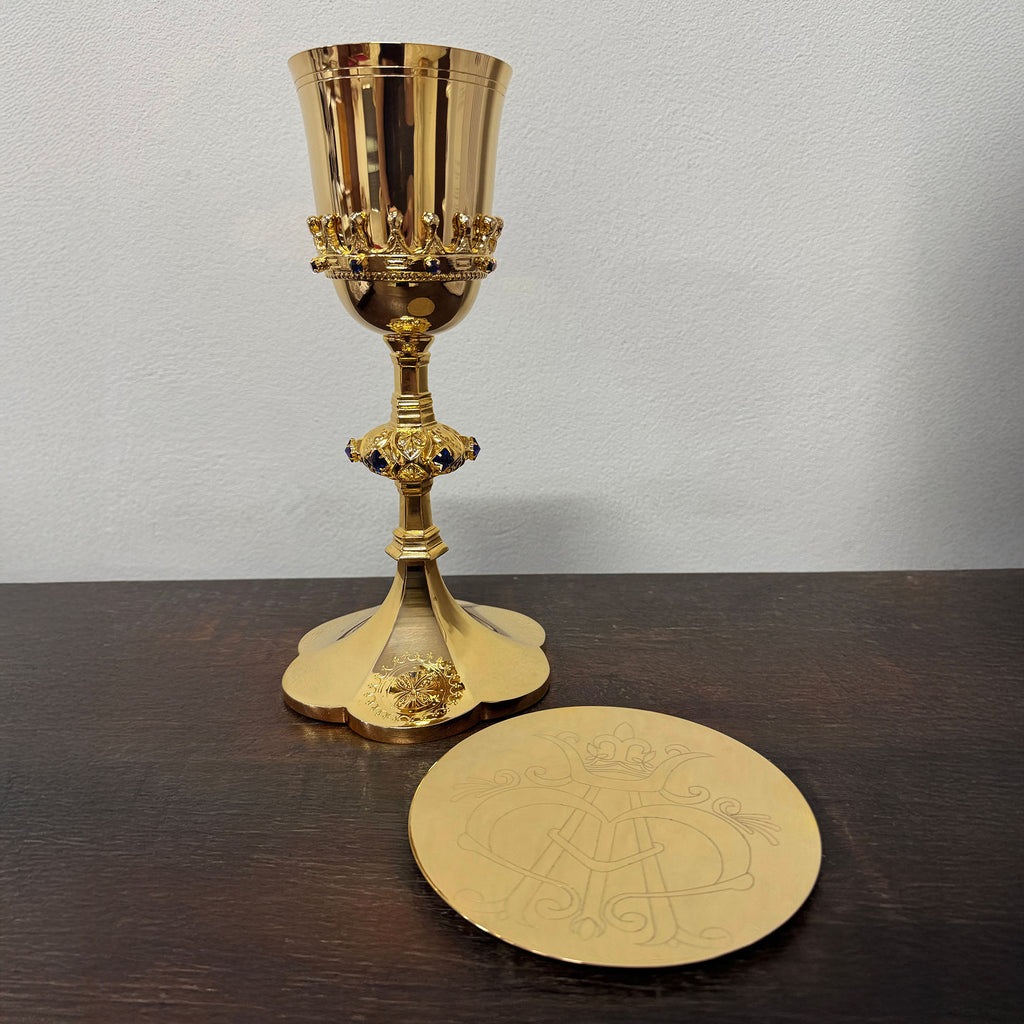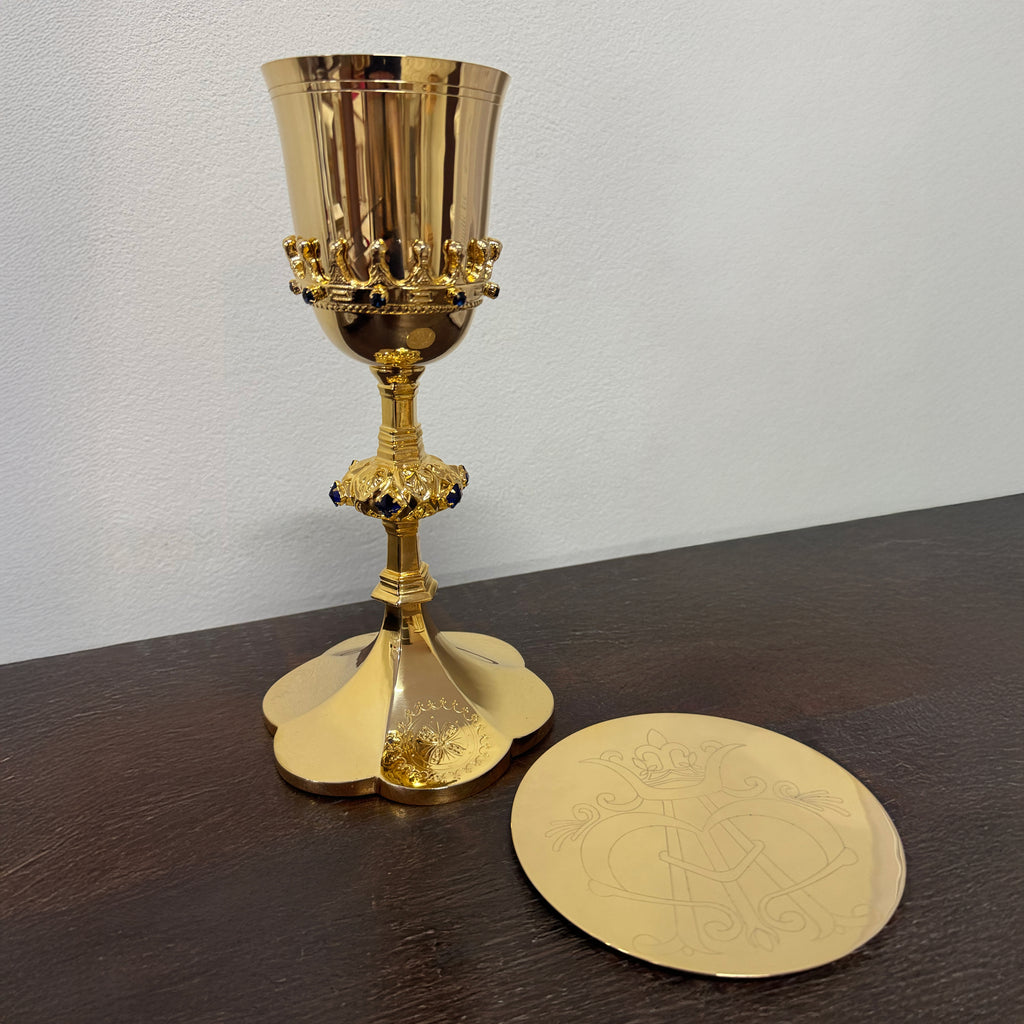 Inspirado na tradição gótica, este belo cálice possui alegorias que fazem referência a elementos desse período: na base, está a cruz pátea, símbolo dos Cavaleiros Medievais; no copo, a grade, cujo estilo relembra as grandes fortalezas da Idade Média. No cálice, elas de fato guarnecem o Tesouro dos tesouros: o preciosíssimo Sangue de Nosso Senhor Jesus Cristo.