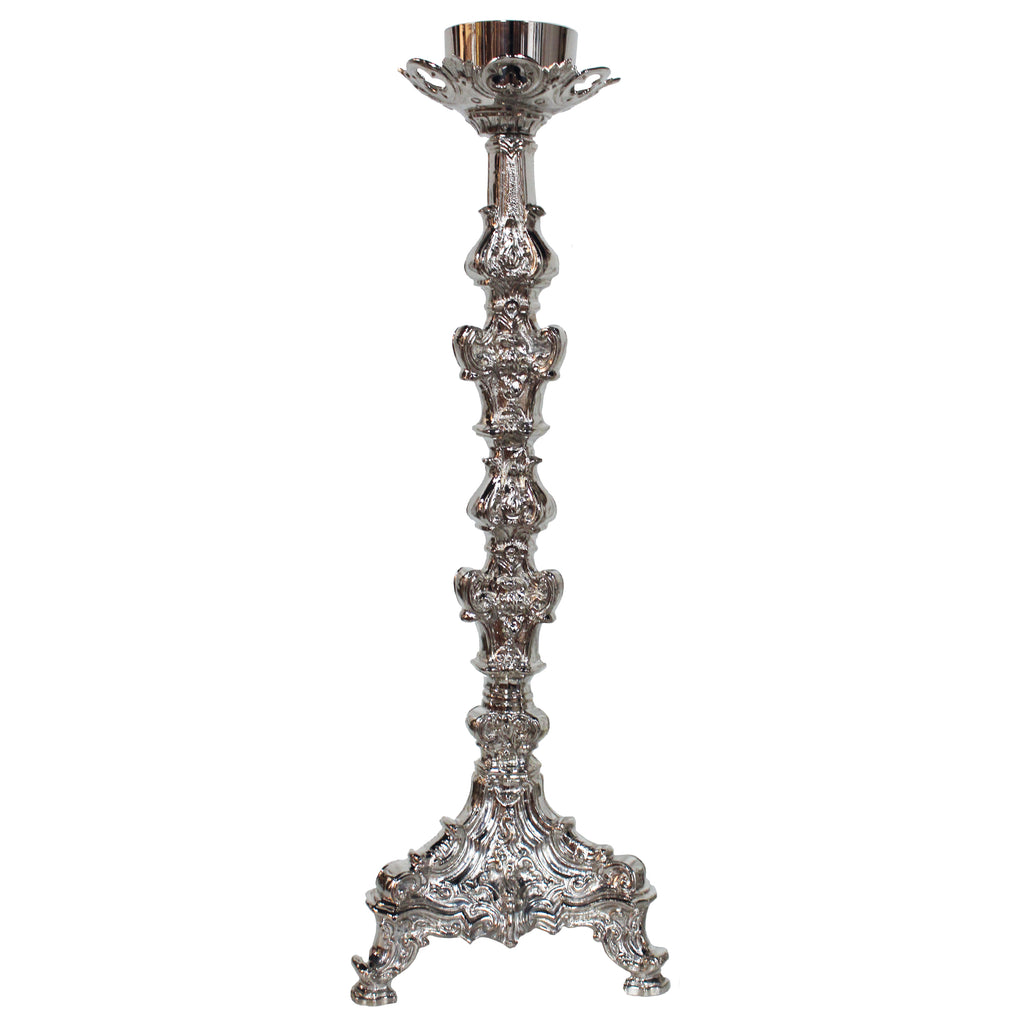 Este é um belíssimo castiçal de inspiração barroca, por carregar uma coluna e base totalmente trabalhados.