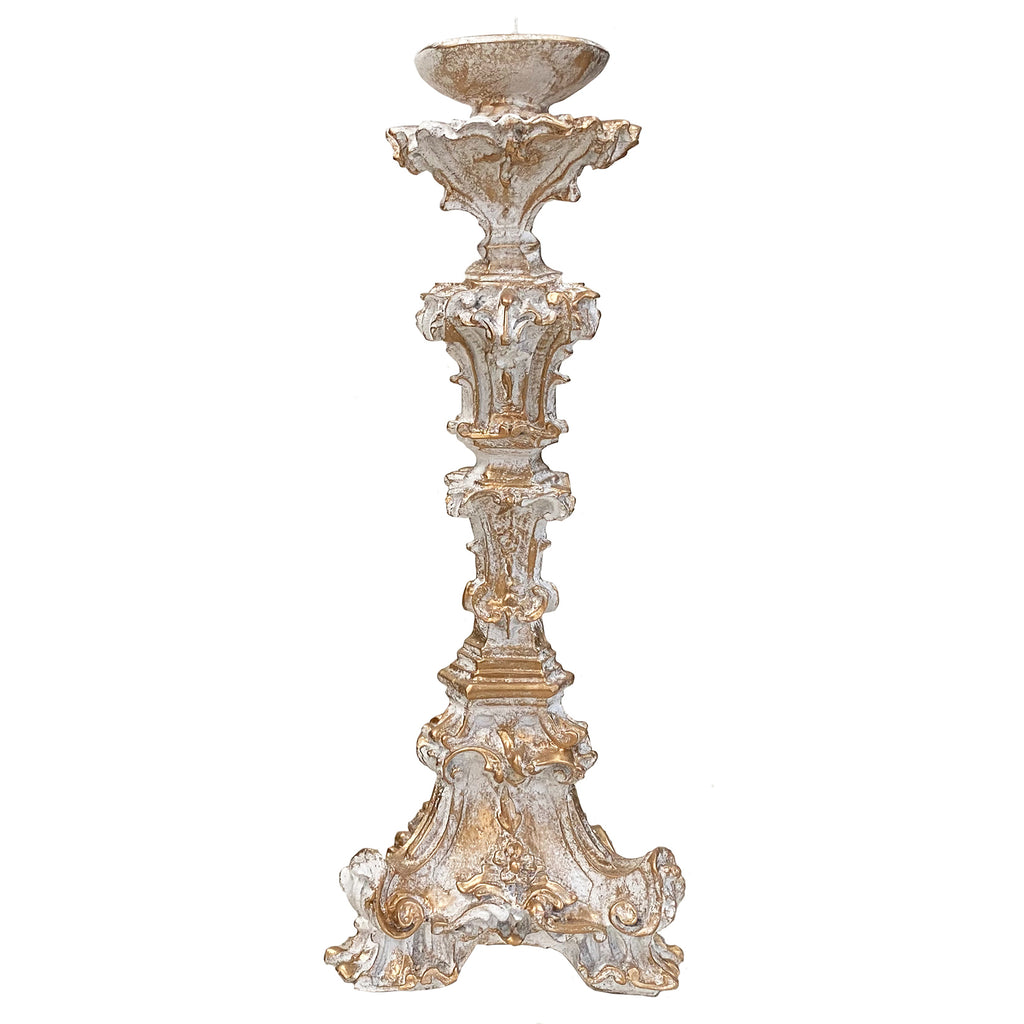Esse é o castiçal de estilo barroco, feito em resina de alta resistência. Pode ser utilizado sobre o Altar ou ao lado de uma imagem devocional.