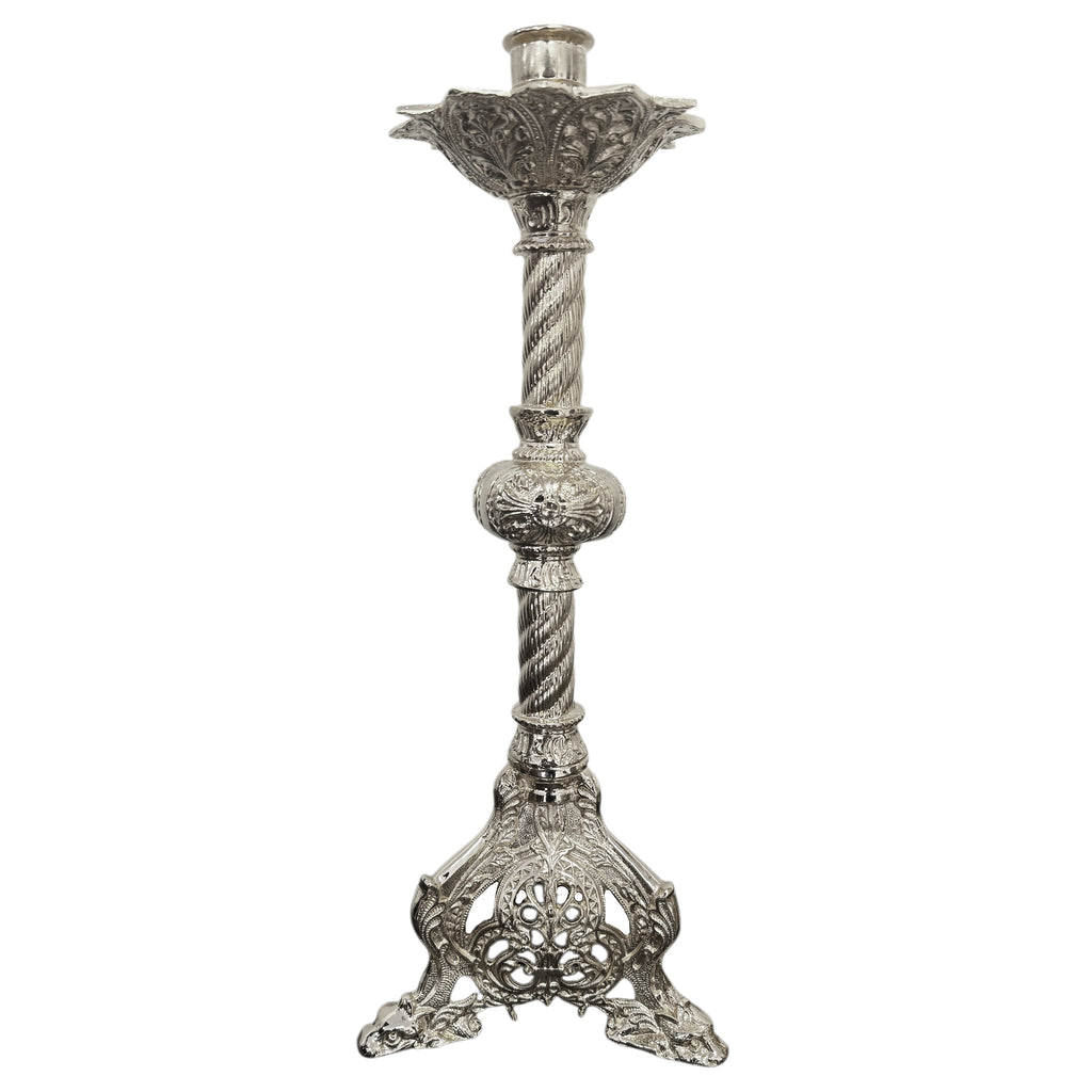 Este é nosso castiçal com uma bela e trabalhada coluna em formato espiral, que evidencia ainda mais os detalhes da peça. É ideal para o altar da igreja Matriz de sua Paróquia ou mesmo para uma comunidade!