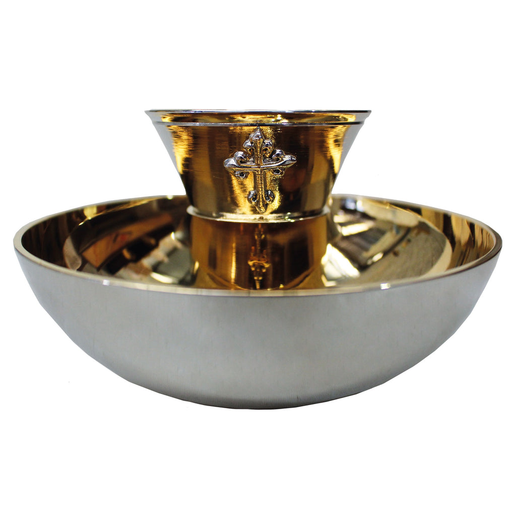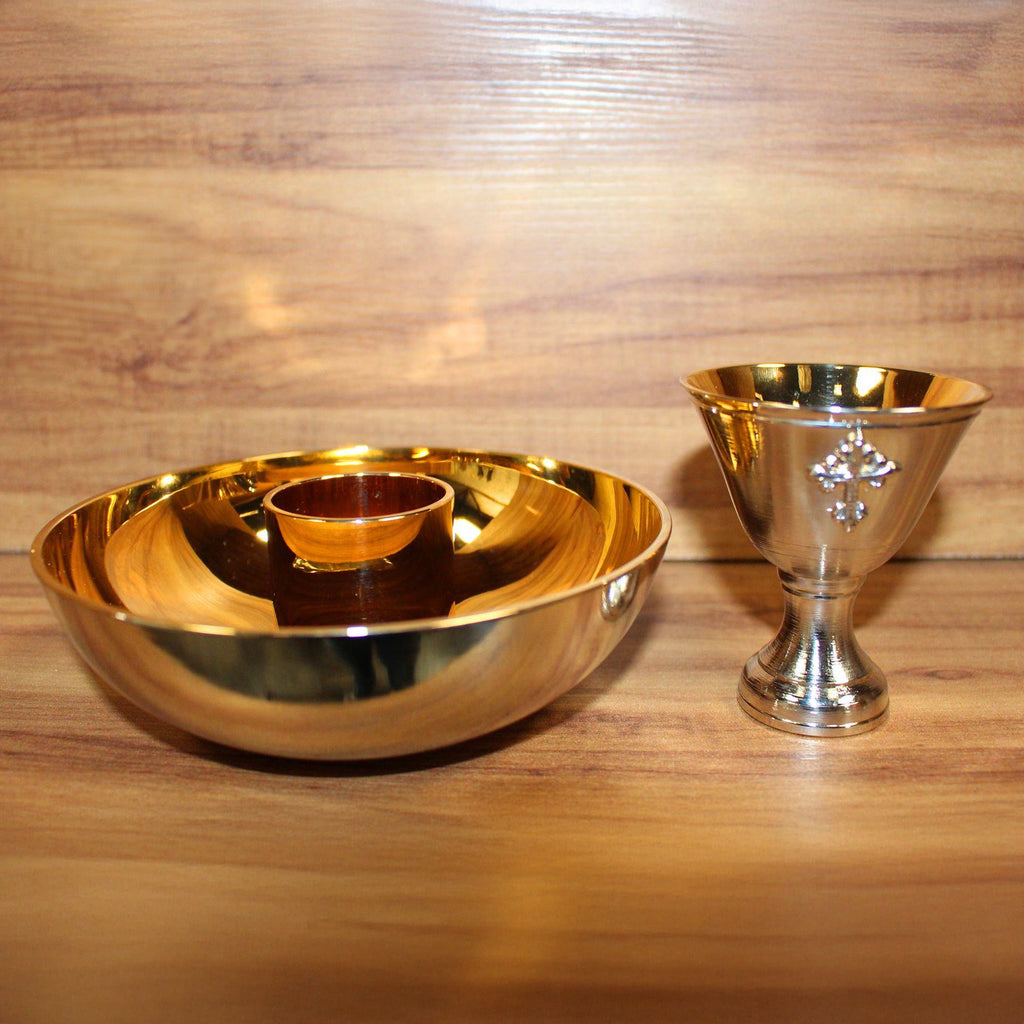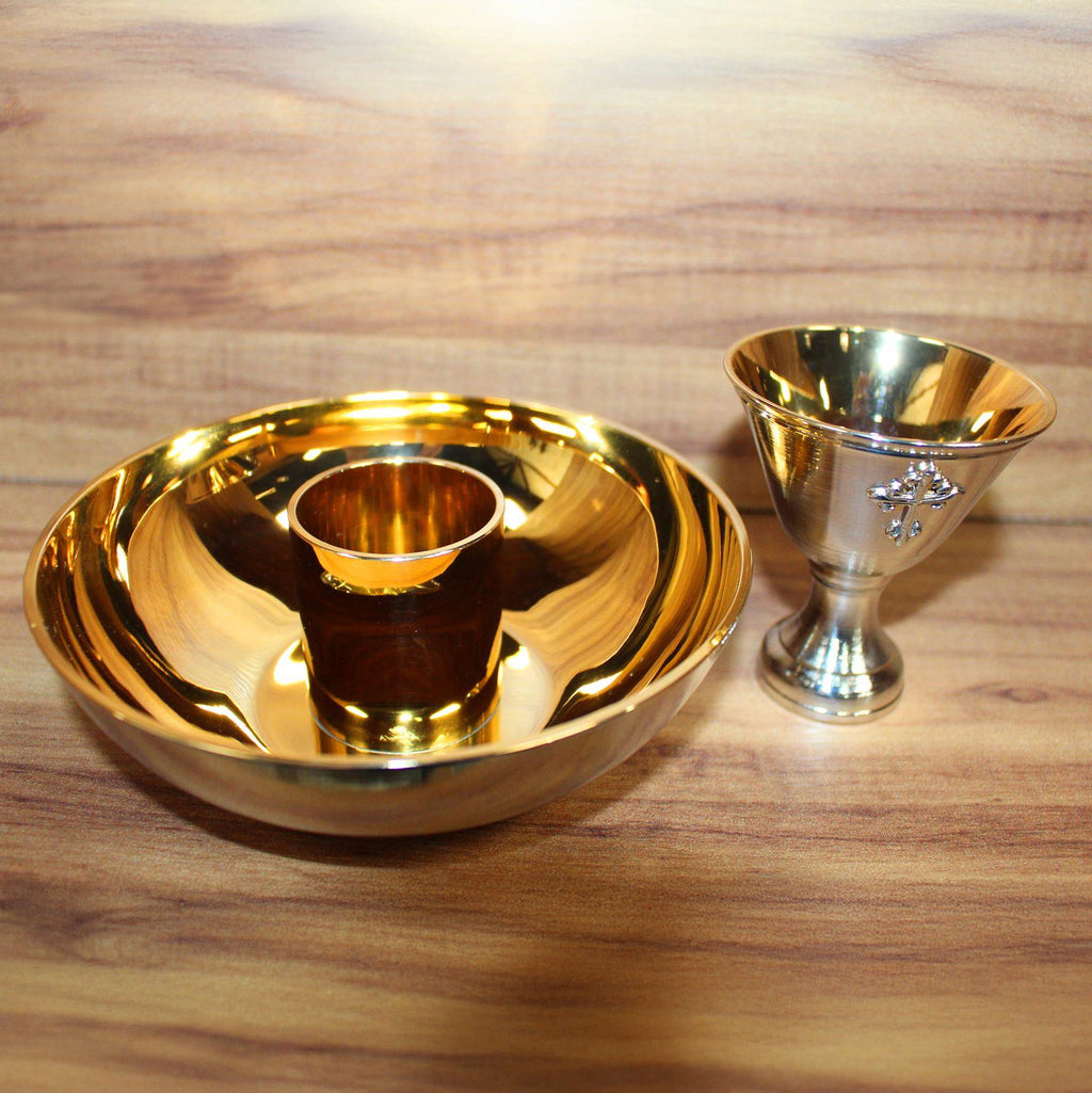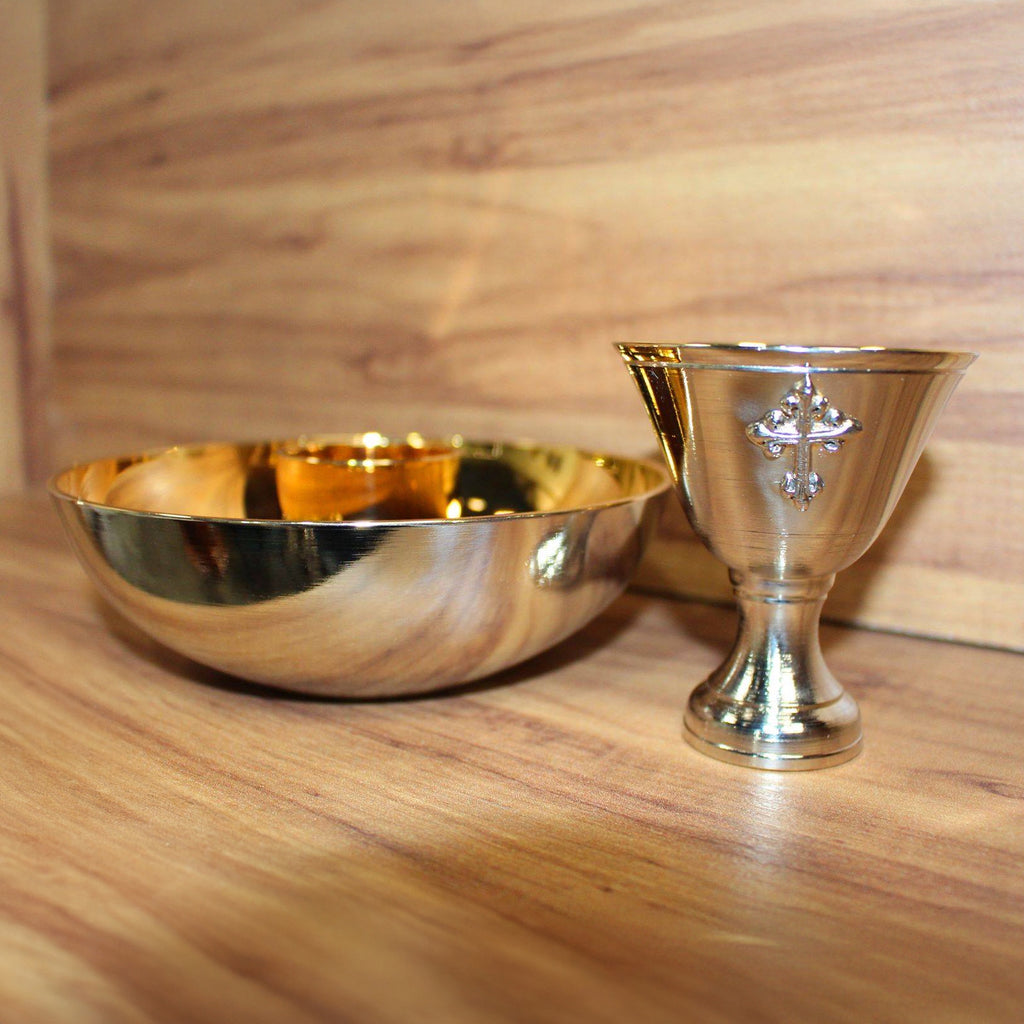 Esses são singelos e práticos vasos sagrados confeccionados para a distribuição da Sagrada Comunhão sob as espécies do pão e do vinho. Confeccionados em latão, nome dado à liga metálica de cobre e zinco de altíssima qualidade, essa versão possui um rico acabamento: banhado a níquel por fora em uma textura escovada e, por dentro, em banho de ouro 24 quilates.