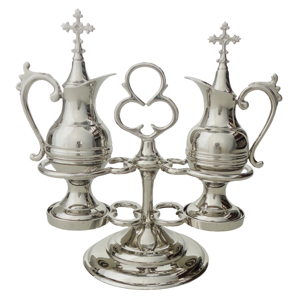 Belíssimo conjunto de galhetas para a celebração da Santa Missa. Possui um suporte seguro que abraça as galhetas, sendo perfeito para uso na Procissão do Ofertório.