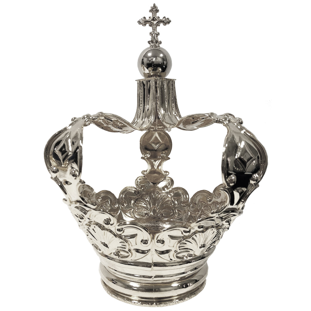 Esta é uma belíssima coroa feita em chapa de metal de alta durabilidade e banhada a níquel. As coroas para imagens sacras são sinais visíveis da participação plena que os santos possuem na glória de Cristo, Rei do Universo. Desde as palavras do Apocalipse, que contemplam a Virgem Maria como “a mulher vestida de sol, tendo a lua sob os pés e sobre a cabeça uma coroa de doze estrelas” (Ap 12,1), a tradição católica compreendeu a coroação dos santos como gesto de veneração e fé: não se trata apenas de enfeite, mas de proclamação solene da realeza espiritual de quem se fez humilde servo de Deus e hoje intercede por nós no Céu.
