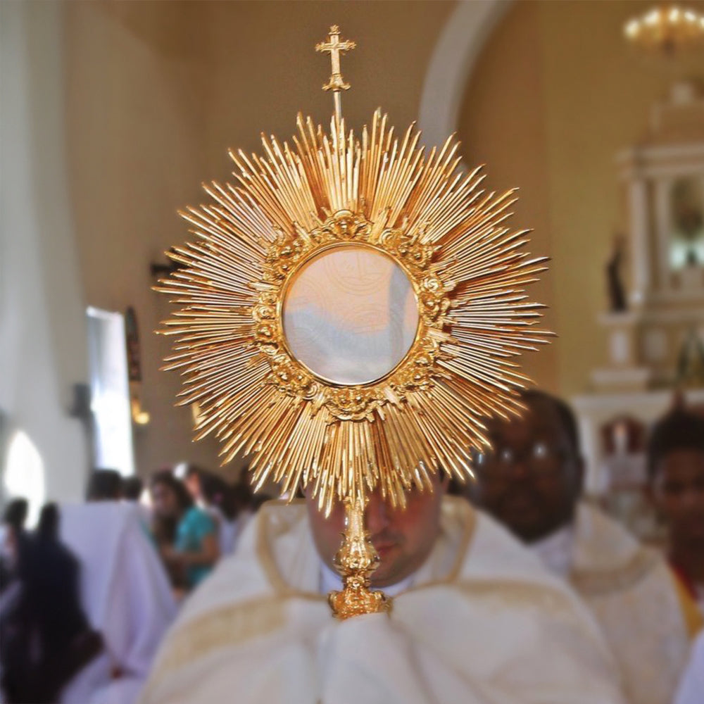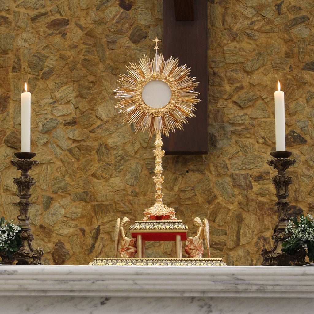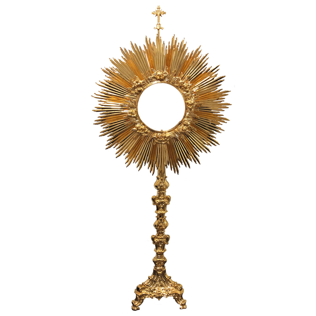 Esta é uma belíssima Custódia Eucarística de inspiração barroca, por carregar uma coluna e base totalmente trabalhados. Possui ainda ao redor da Hóstia as representações das Hierarquias Angélicas em adoração. Este é o Ostensório de nossa linha que pode comportar uma hóstia de até 16cm de diâmetro!