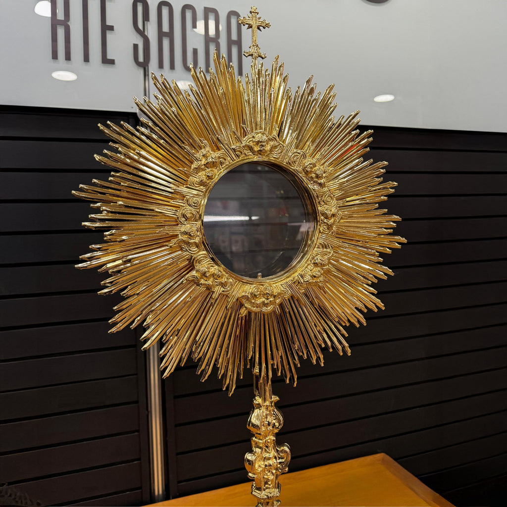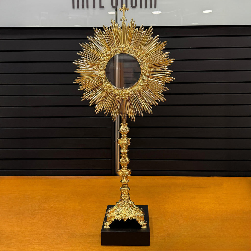 A coluna e a base do Ostensório são confeccionados em liga metálica fundida de altíssima qualidade. Os raios são feitos em latão, nome dado à liga metálica de cobre e zinco. Toda a peça é integralmente banhada a ouro 24 quilates.
