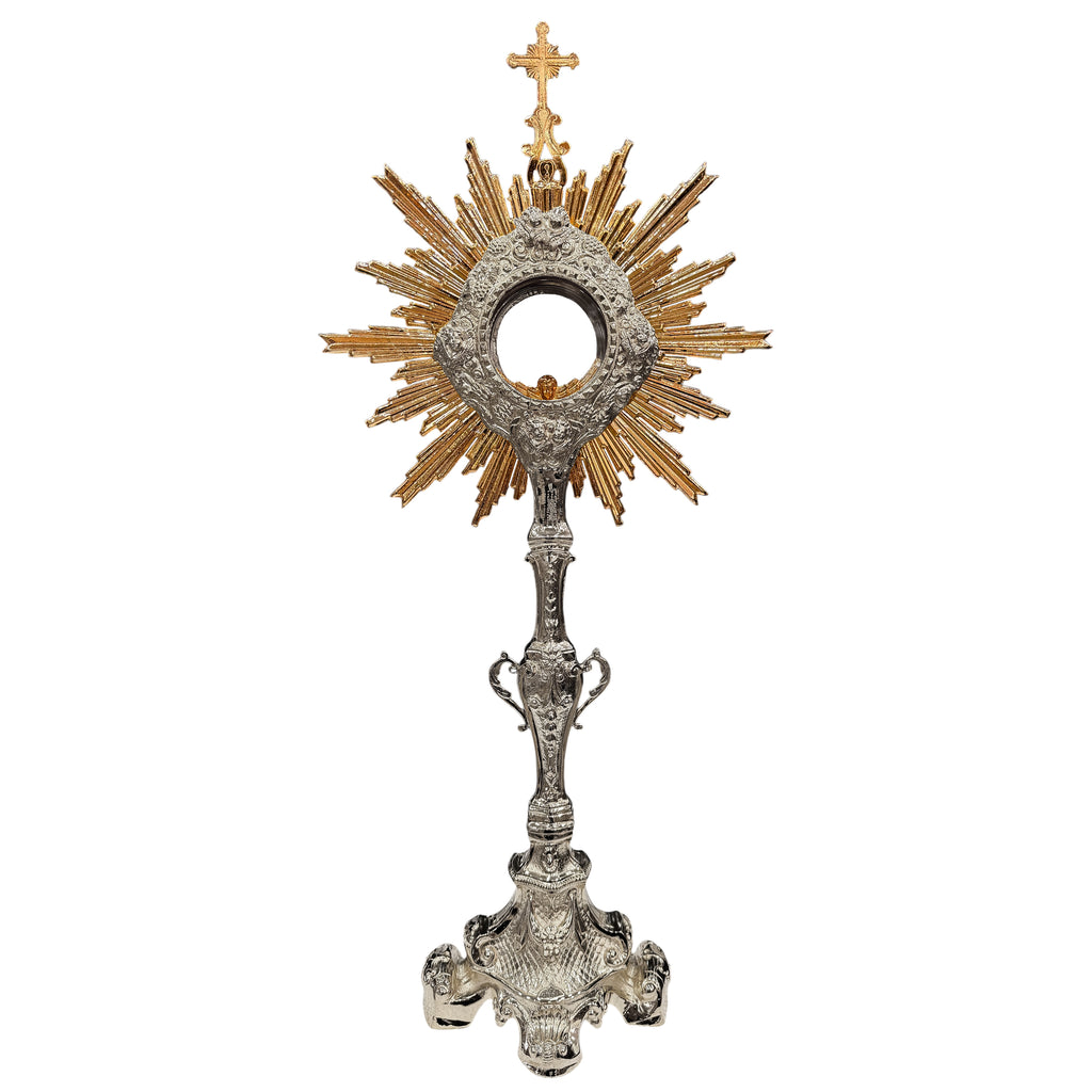 A coluna e a base do Ostensório são confeccionados em liga metálica fundida de altíssima qualidade. Os raios são feitos em latão, nome dado à liga metálica de cobre e zinco. Toda a peça é integralmente banhada a níquel.