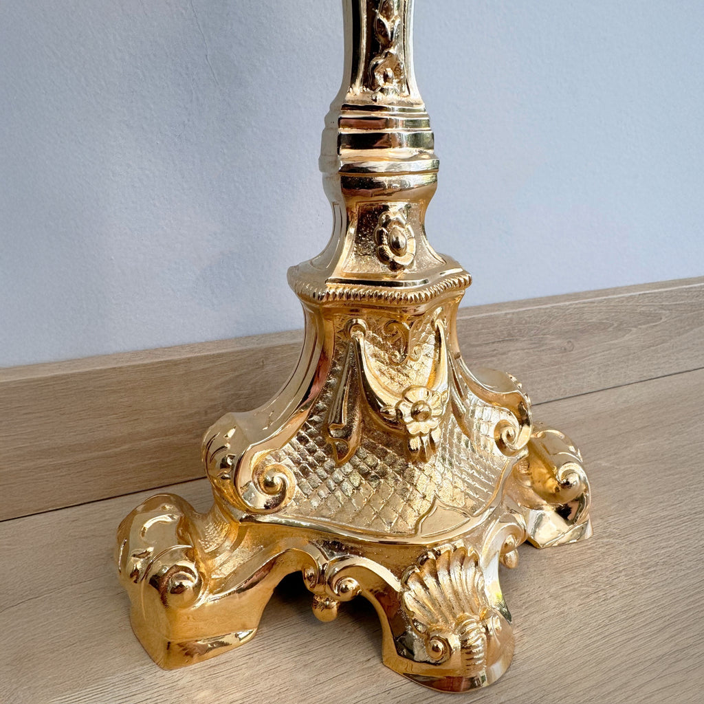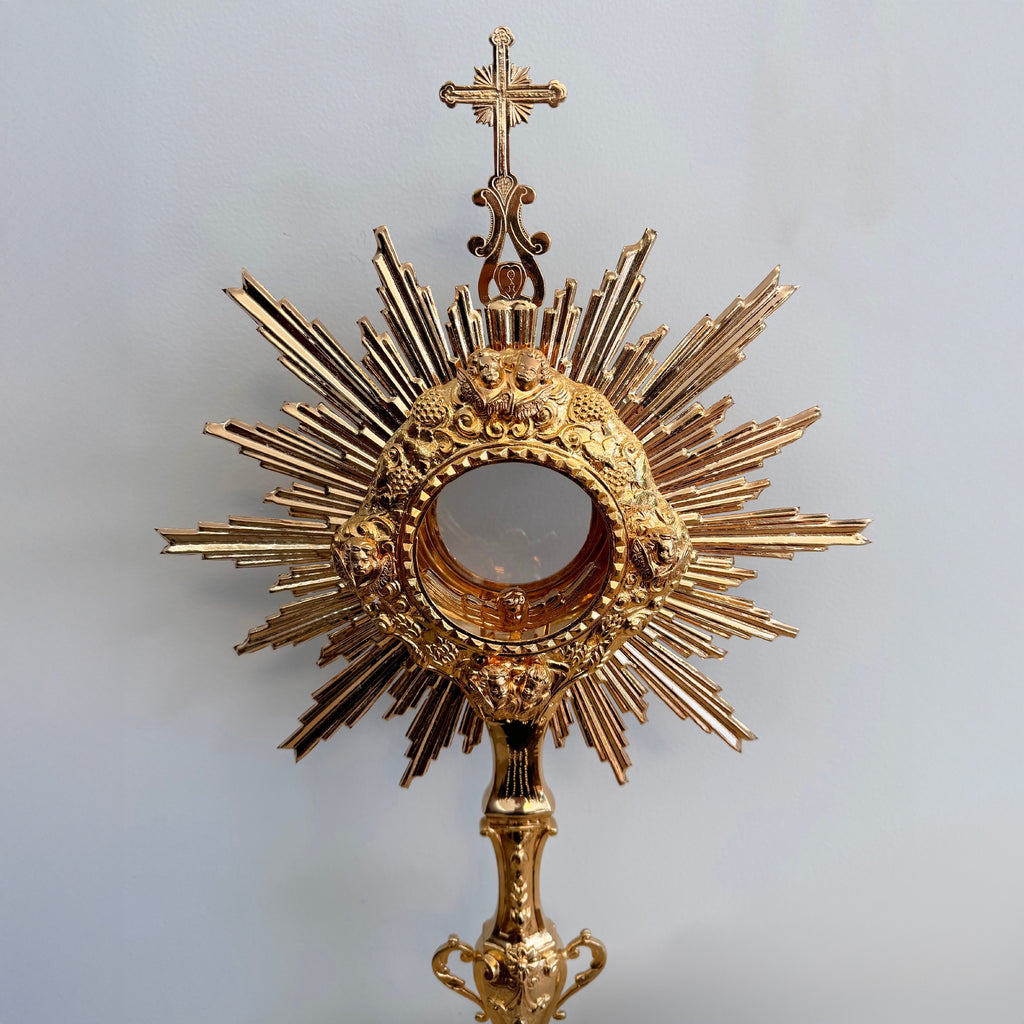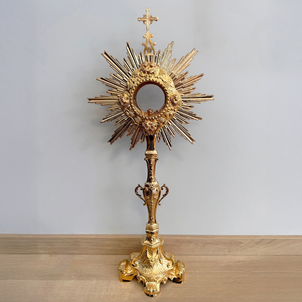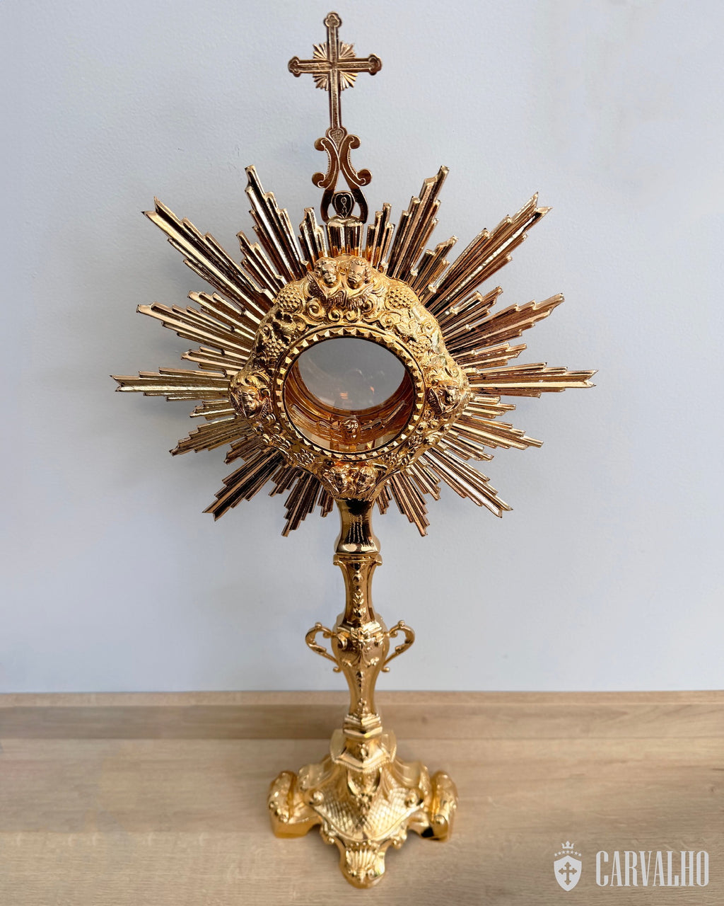 O Ostensório Neoclássico combina elegância com sutileza. Esse é um modelo bem peculiar de Custódia Eucarística, muito diferente dos modelos que estamos mais acostumados: um ostensório mais alto e com raios um pouco menores. É uma peça que lembra muitos modelos antigos, tradicionais em igrejas históricas.