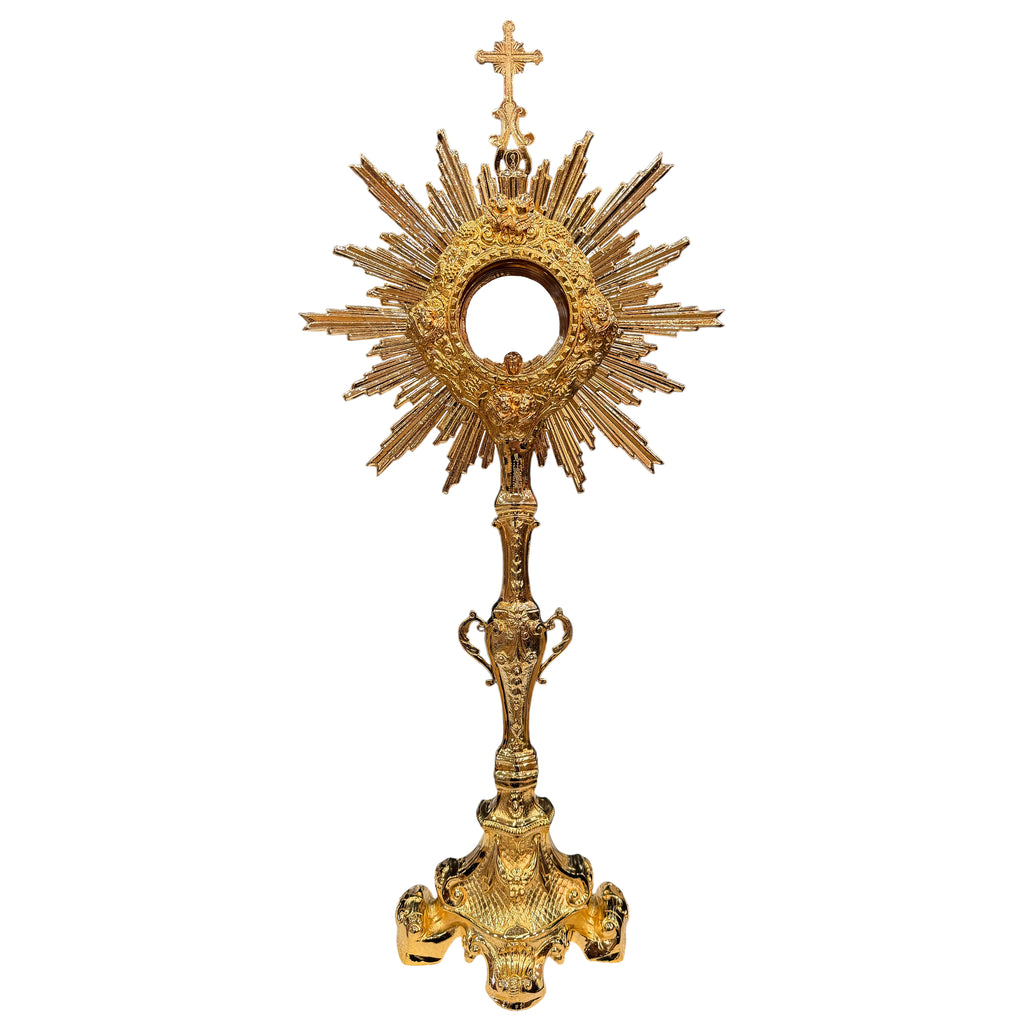A coluna e a base do Ostensório são confeccionados em liga metálica fundida de altíssima qualidade. Os raios são feitos em latão, nome dado à liga metálica de cobre e zinco. Toda a peça é integralmente banhada a ouro 24 quilates.