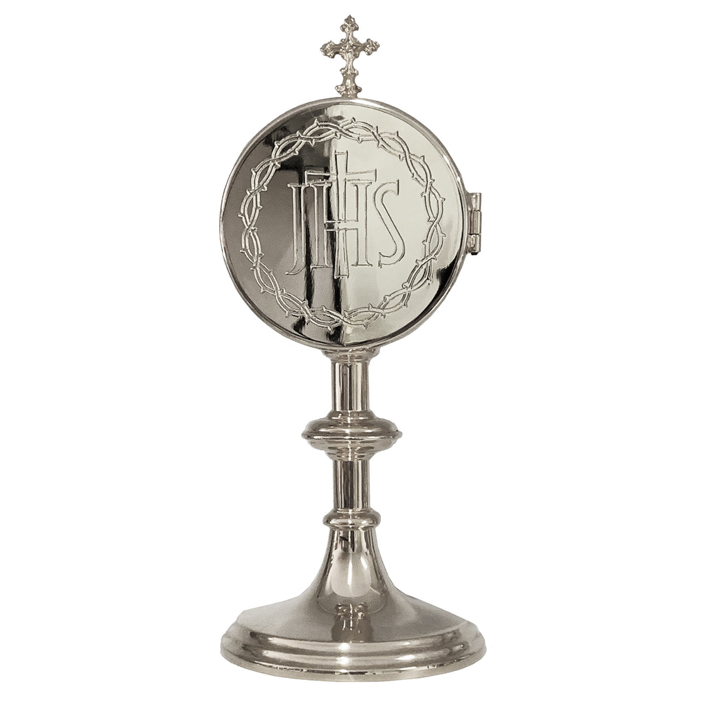 Esta peça vem acompanhada da luneta para colocar a hóstia. Ela é feita em latão, nome dado à liga metálica de cobre e zinco. Nesta versão, é integralmente banhada a níquel.