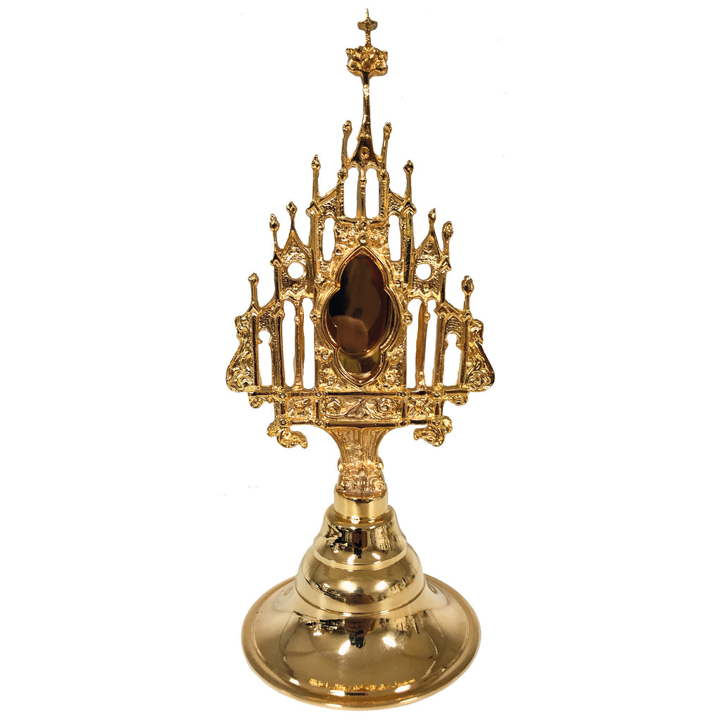 Este é o Relicário Francês, um receptáculo imponente e de forte inspiração gótica para receber a relíquia de seu santo de devoção ou mesmo para a veneração pública dos fiéis na igreja. Feito em liga metálica fundida de altíssima qualidade e preparada por nós, este modelo é banhado a ouro 24 quilates.