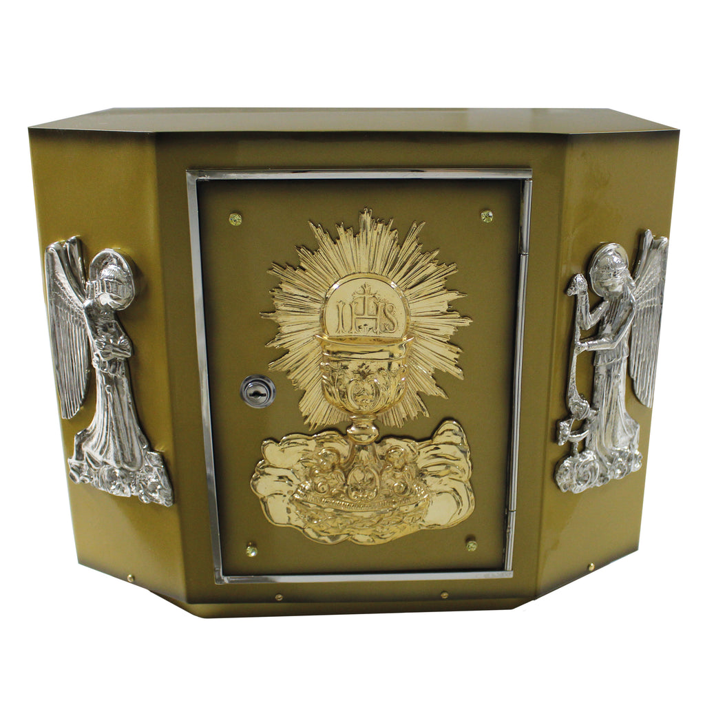 Este sacrário foi desenvolvido para oferecer um espaço digno e seguro para a reserva eucarística, conforme manda a tradição da Igreja. Com estrutura resistente feita em metal e acabamento de qualidade, é ideal para capelas e igrejas paroquiais. Possui um design dividido em três faces, com estrutura frontal chanfrada, o que proporciona ainda mais destaque e profundidade para a peça, sendo compatível com diversos estilos de altar. Na porta frontal, destaca-se uma belíssima representação da Eucaristia, com o Cálice e a Hóstia Consagrada, símbolo central do Santo Sacrifício. A porta é ladeada por dois belíssimos anjos em adoração.