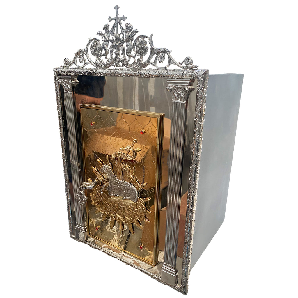 Enquanto a porta do sacrário é integralmente banhada a ouro 24 quilates, o aplique do Cordeiro possui um elegante acabamento de banho misto com níquel e ouro. As colunas, o frontão e as molduras são banhados a níquel. O interior é totalmente revestido com acolchoado de tecido litúrgico. Acompanha 2 chaves ornamentadas.