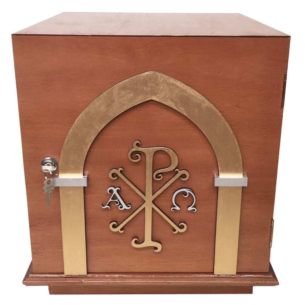 Este sacrário foi desenvolvido para oferecer um espaço digno e seguro para a reserva eucarística, conforme manda a tradição da Igreja. Com estrutura resistente feita em madeira maciça de jequitibá-rosa e interior revestido em metal dourado, é ideal para capelas e comunidades. Seu design valoriza a sobriedade e a sacralidade do ambiente litúrgico, sendo compatível com diversos estilos de altar. Na porta frontal, debaixo de belos arcos ogivais que lembram uma ermida, está o Cristograma XP, isto é, as duas primeiras letras do nome de Nosso Senhor Jesus Cristo em grego: ΧΡΙΣΤΟΣ.