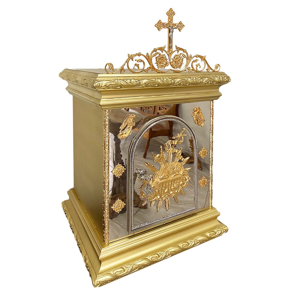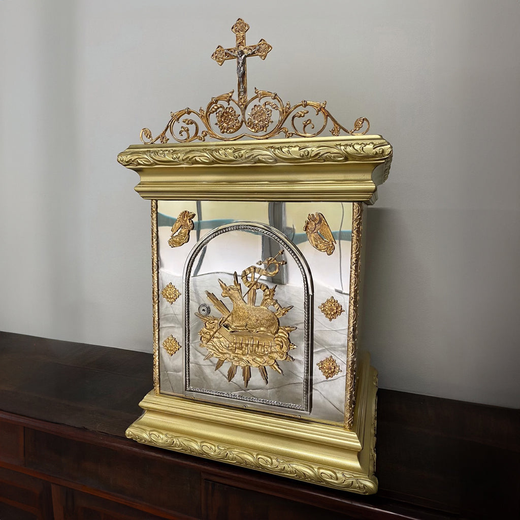 A superfície externa é composta por metal pintado de dourado, enquanto a parte frontal recebe banho de níquel. Os detalhes do Cordeiro, as molduras e os Anjos são banhados a ouro 24 quilates. O interior é totalmente revestido com acolchoado de tecido litúrgico. Acompanha 2 chaves ornamentadas.