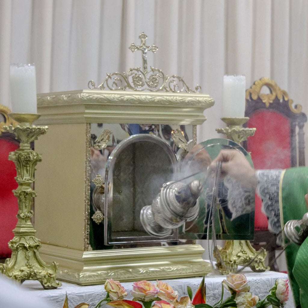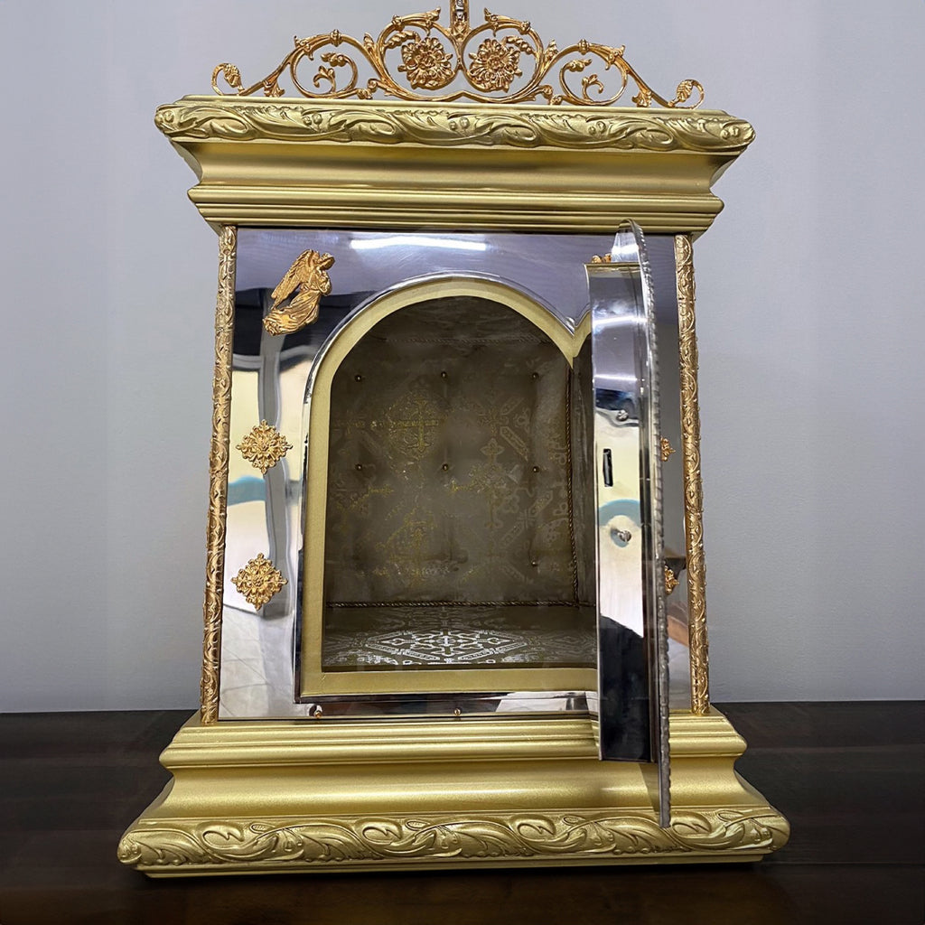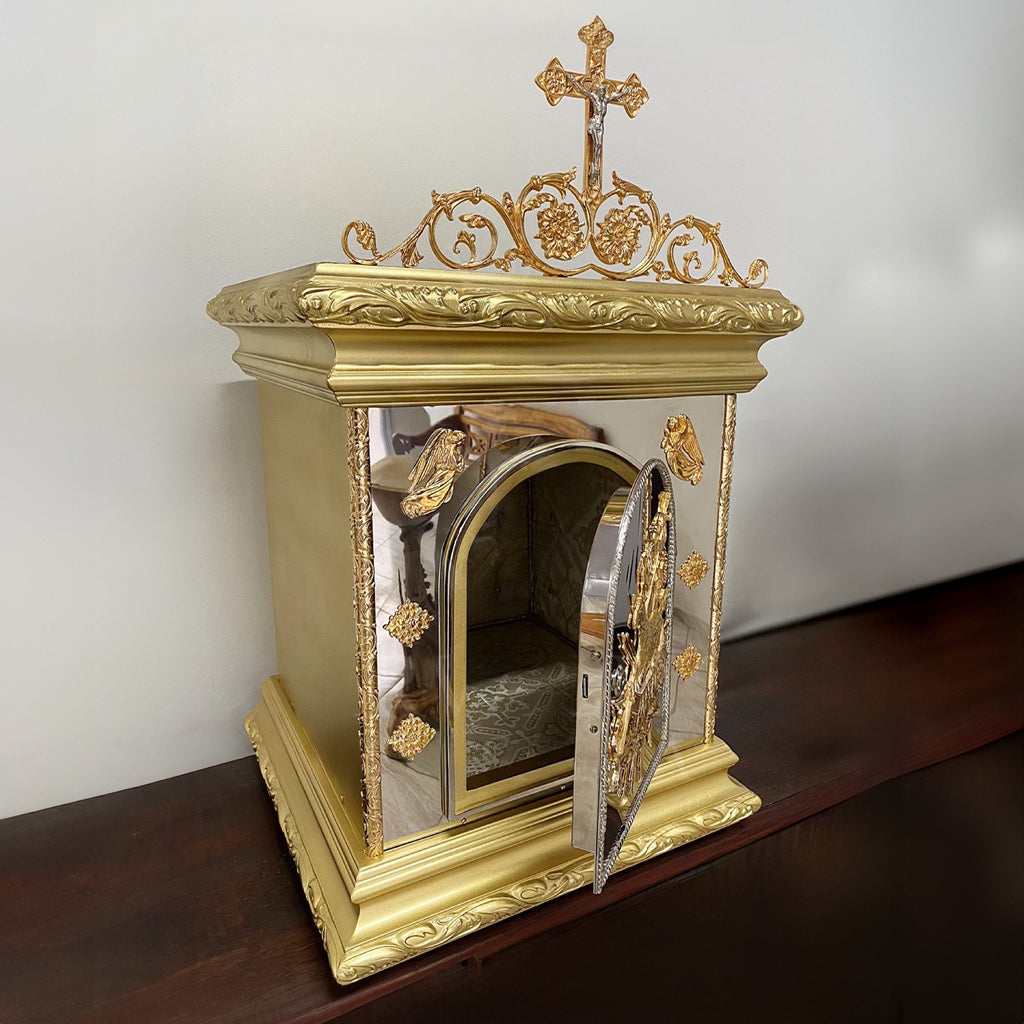 Este sacrário foi desenvolvido para oferecer um espaço digno e seguro para a reserva eucarística, conforme manda a tradição da Igreja. Com estrutura resistente feita em metal, sendo a base e o teto feitos em madeira, toda a peça apresenta um acabamento de extrema qualidade, sendo ideal para o Altar ou para a Capela do Santíssimo de sua igreja. Seu formato foi cuidadosamente pensado para destacar a imponência e a majestade da Santíssima Eucaristia.