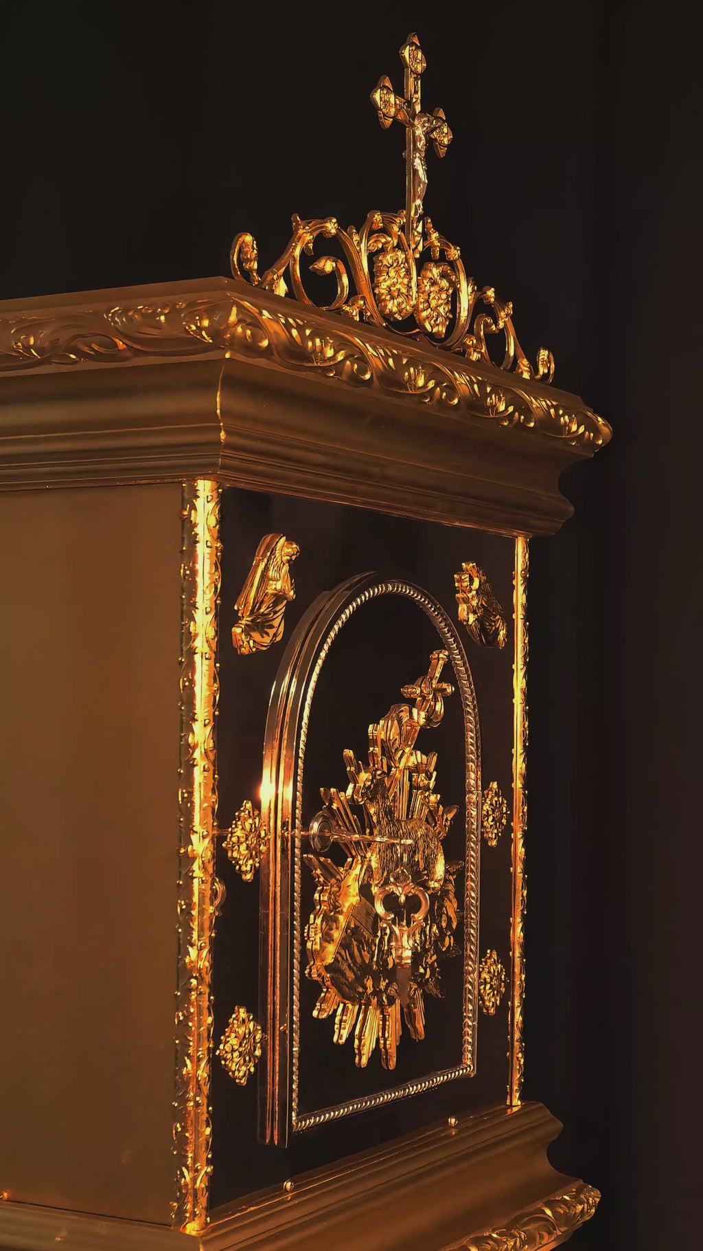 Na porta, destaca-se uma belíssima representação do Cordeiro de Deus, símbolo de Cristo Ressuscitado e glorioso. Assentado sobre o livro dos sete selos, tal como descrito no Livro do Apocalipse, o Cordeiro manifesta-se como Aquele que venceu a morte e possui em Suas mãos o domínio da história e a plenitude dos mistérios divinos. A porta é ladeada por dois Anjos em adoração. Em cima do sacrário, sobre um elegante teto trabalhado, destaca-se o belíssimo frontão, em que se ergue a Cruz do Senhor, em um acabamento misto de ouro e níquel.