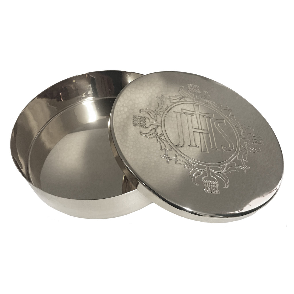 A peça é feita em latão, nome dado à liga metálica de cobre e zinco. Nesta versão, é integralmente banhada a níquel e acomoda hóstias de até 16cm de diâmetro.